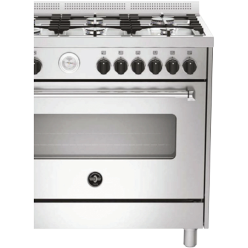 Bring a professional touch to your kitchen with the La Germania Americana 90cm Dual Fuel Upright Cooker. With its gleaming stainless steel finish and spacious 142L capacity this freestanding oven makes an impressive statement. Six gas burners give you the responsive precise heat control you need for simmering sauces or stir-fries while the electric oven provides even baking results across 11 functions including bake grill and convection. Triple-glazed doors keep the heat inside the oven cavity and features like fast preheating get dinner on the table sooner. This La Germania cooker offers the flexibility of gas and electric in a durable easy-to-clean stainless steel package. With a 2-year manufacturer's warranty it's built to handle years of family meals with minimal fuss. Give your kitchen a stylish efficiency upgrade with the La Germania Americana 90cm Stainless Steel Dual Fuel Upright Cooker. The manufacturer's part number for this product is AMS96C61LBX. Discover how this quality cooker can make meal prep easier.