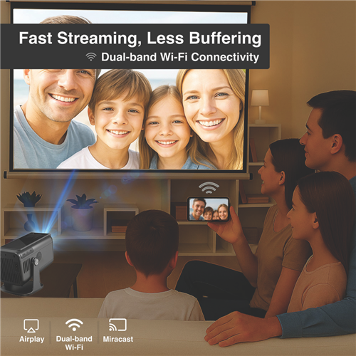 This 1080p Android projector brings the big screen experience home with laser projection technology that displays images from 30 to 250 inches in size. With 300 ANSI lumens of brightness and a 30000-hour bulb life you'll enjoy clear HD viewing for years to come. The multi-angle tube design lets you position it perfectly starting from just 0.8m away from your screen with a 1.13:1 throw ratio. Connect easily via HDMI USB or wirelessly with dual-band WiFi6 and Bluetooth 5.0. Weighing just 1kg this compact projector includes digital keystone correction and zoom capability. Comes with a 1-year warranty. Model PJ-TUFHA3-065.