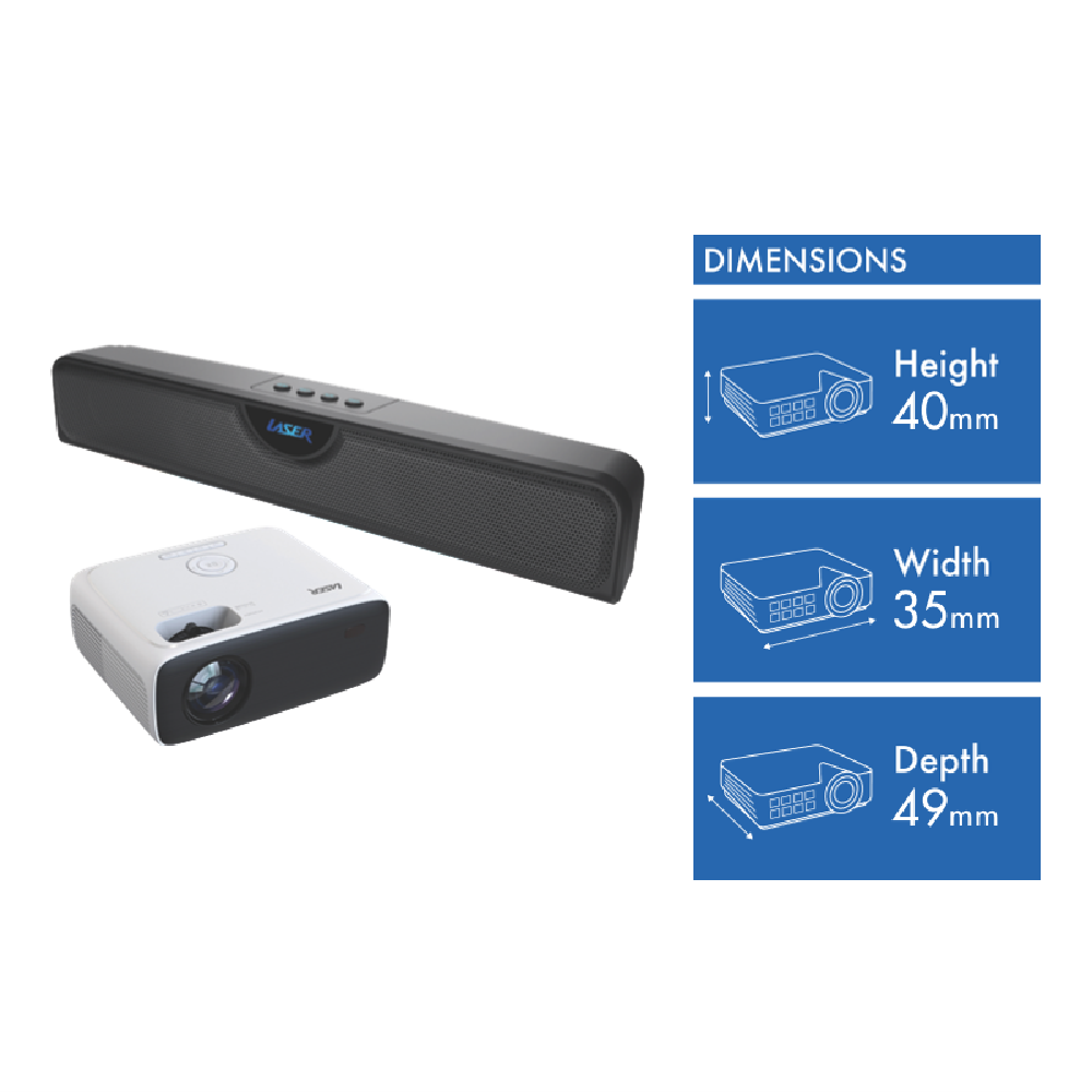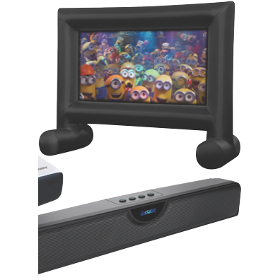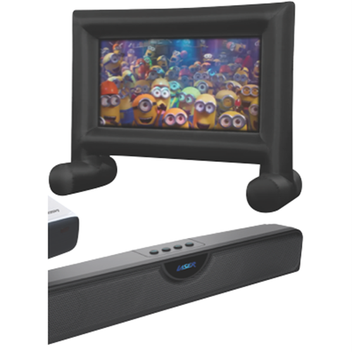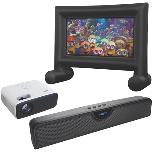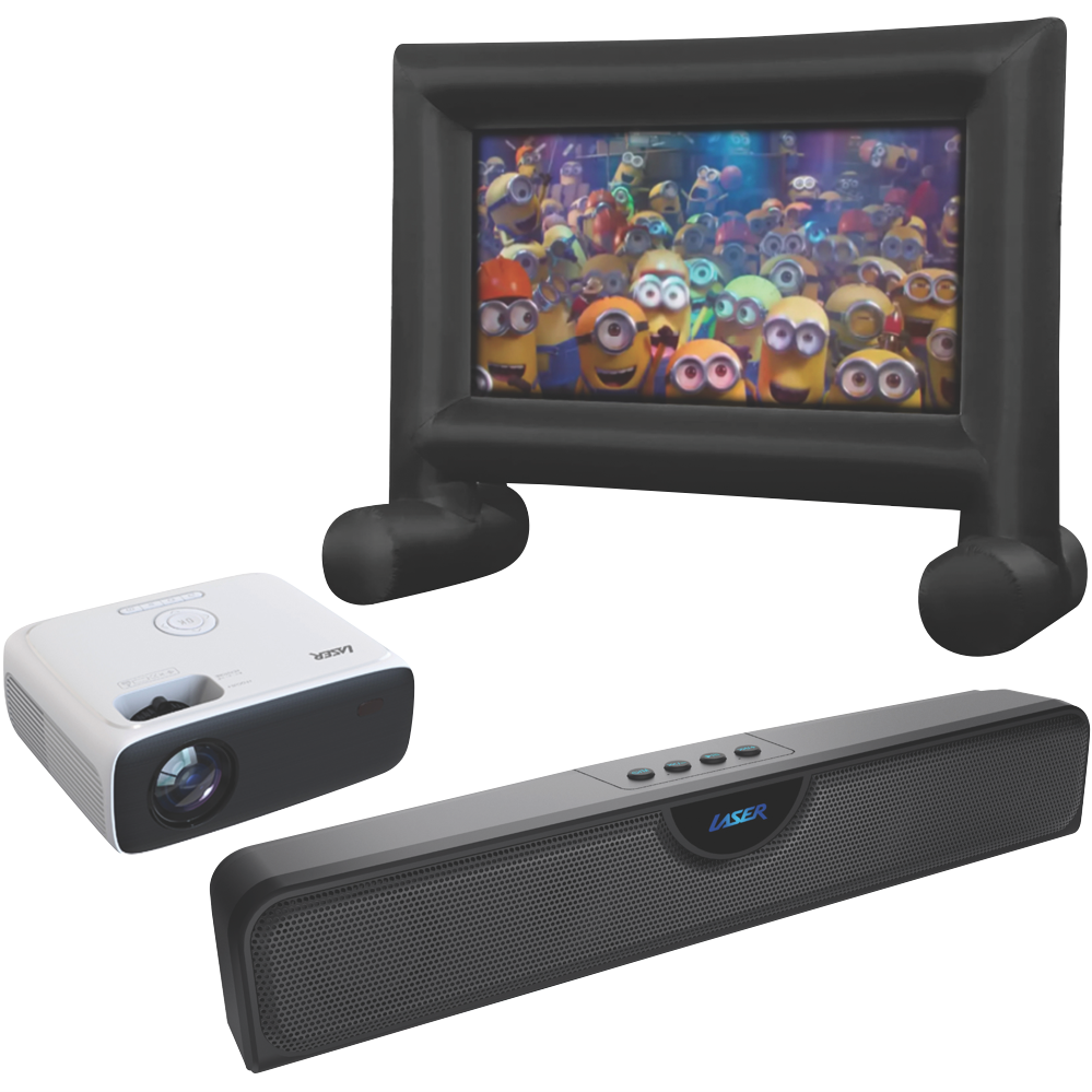 Transform your backyard into a cinema with this Laser 1080P Cinema Projector Outdoor Bundle. The portable projector delivers Full HD 1920 x 1080 resolution on the included 144-inch inflatable screen giving you a true big-screen experience. It supports both 16:9 and 4:3 aspect ratios with digital keystone correction to get the perfect picture alignment. Connect devices via HDMI USB or MicroSD or wirelessly through Bluetooth 5.0. The bundle comes complete with everything you need - the projector remote lens cover mini Bluetooth soundbar inflatable screen with built-in blower detachable white movie screen carry bag and all mounting accessories. Backed by a 1-year manufacturer's warranty. Model number: PJT-BYCBL-040.