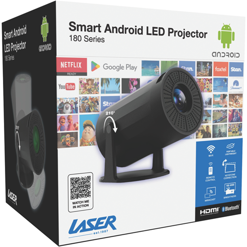 This portable LED projector brings big-screen entertainment anywhere displaying Full HD 1920 x 1080 resolution content at sizes from 30 to 100 inches. With 180 lumens of brightness and support for both 16:9 and 4:3 aspect ratios you'll enjoy clear viewing even in moderately lit rooms. The Android 11 operating system gives you access to your favorite streaming apps while both 2.4GHz and 5GHz Wi-Fi plus Bluetooth 5.0 keep you connected. Its compact size (90mm width x 90mm depth x 135mm height) and lightweight design (just 0.84kg) make it perfect for moving between rooms or taking on trips. The 3W speaker provides decent audio for such a small unit and with digital keystone correction you'll get properly aligned images even when projecting at angles. Comes with a 1-year warranty. Model PJ-TUHDAB-877.
