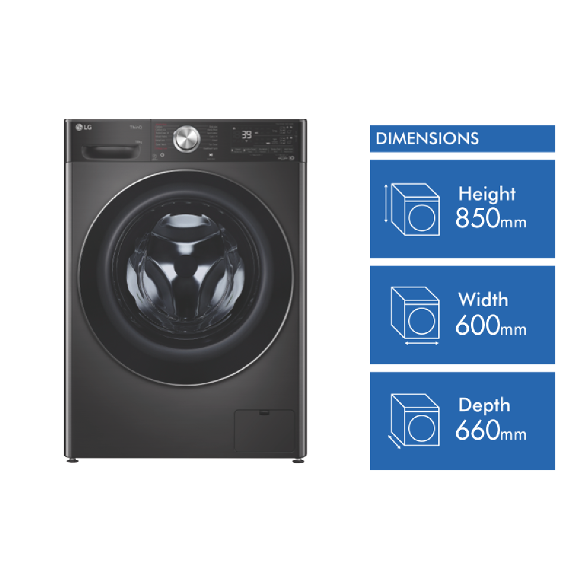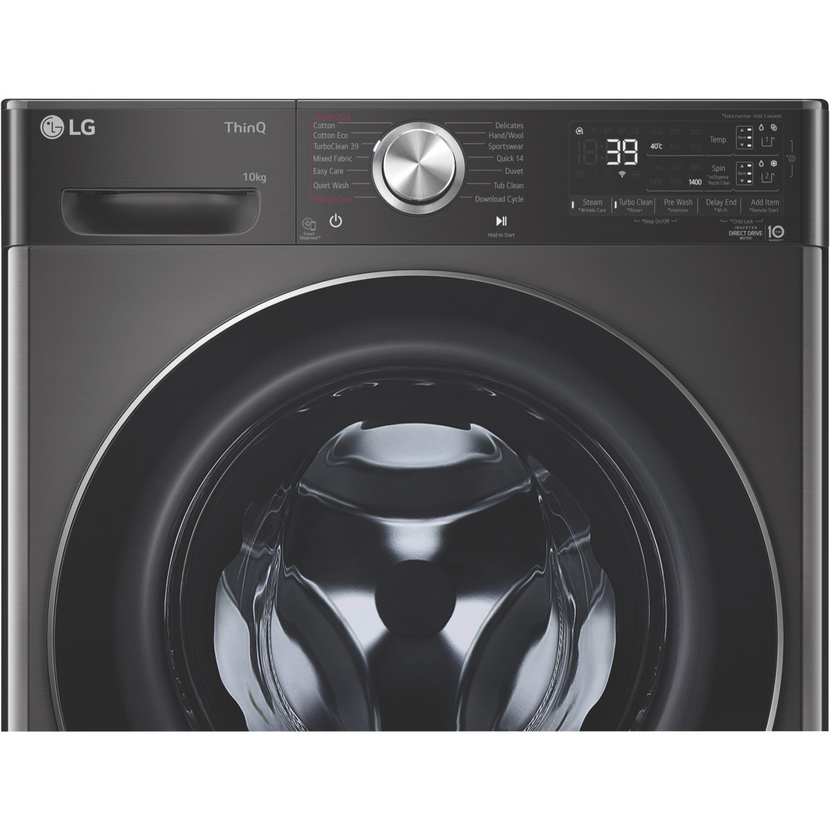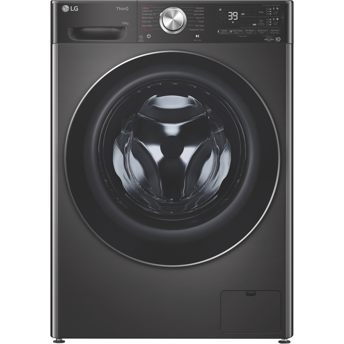 Have your clothes washed carefully and efficiently with the LG 10kg Front Load Washer WV10-1410B. LG's ezDispense auto dose functionality detects the weight of each load and releases a preset dose according to the load size for up to 35 medium size loads(1) to save you the time and hassle of filling the dispenser every cycle. The dispenser is flexible and able to be used individually or linked as you wish to store two types of detergent for easy switching per clothing type. There's also a manual dispenser for powder gel or other liquids. Take the guesswork out with AI Direct Drive(2) technology weighing the load and assessing fabric softness to automatically select optimal wash motions for thorough cleaning and clothing care. Enjoy fuss free maintenance with the compartments being removeable combined with the Auto Nozzle Clean cycle. 6 Motion Direct Drive is a system based on precise hand washing done automatically ensuring your clothes are clean but not stressed or damaged inside including Scrubbing that quickly alternates to remove stubborn stains or Filtration ensuring even water saturation. Strong water jets operate during the wash and rinse with a 5kg load able to be cleaned in only 39 minutes thanks to the TurboWash39 cycle. Select Allergy Care with Steam-plus to open up garment fibres and reduce exposure to dust mites pollen allergens and bacteria. Choose Wrinkle Care in conjuction with Steam-plus to reduce clothing wrinkles straight out of the machine. The durable tempered glass door and stainless steel lifter are ready for many years of operation with the Inverter Drive Drive Motor covered by its own 10 Year Parts Warranty(3). Pair this washer with an LG TWINWash Mini (sold separately) to add and seamlessly control a large and small load of washing at one time perfect for separating whites and colours. Utilise the LG ThinQ app that works with Google Assistant and allows remote start and monitoring of cycles washing history diagnosing problems and even download additional wash cycles(4). Disclaimer: (1) ezDispense available in selected cycles. 35 medium loads based on preset dosage setting of 42mL (2-6kg load size) with detergent and softener compartments in 'linked' mode. Dosage amounts vary for specialty cycles. Not compatible with powdered ultra concentrated or gel detergents. (2) AI DD available for Cotton Easy Care and Mixed Fabric Cycles only. (3) 2 year warranty for parts and labour on product additional 8 years on Inverter Direct Drive Motor part only. (4) LG ThinQ app available on Android or iOS smartphones. Compatible smartphone with Android 4.1.2 (Jellybean) or later or iOS 9 or later required for LG ThinQ app. Phone and Home Wi-Fi Data connection and product registration on the ThinQ app required. Smart features and voice assistant product may vary by country and model. Features and services may be changed by LG without notice.
