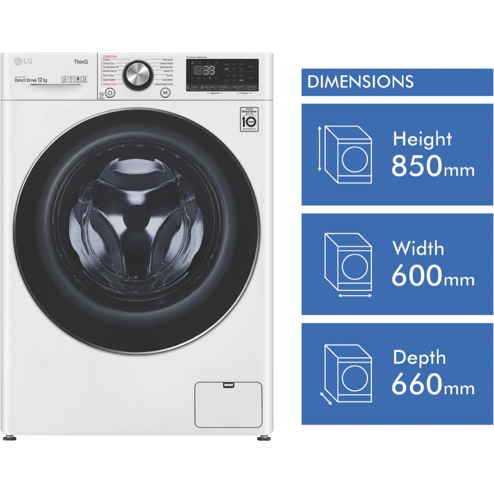 Enjoy the convenience of a powerful 12kg washing machine from LG that makes laundry day a breeze. With a generous 12kg capacity the LG Front Load Washer can handle large loads in a single wash saving you time and effort. The White finish gives this washer a clean classic look suitable for any laundry room. Reaching max spin speeds of 1400rpm this machine removes more water from clothes to slash drying times. Boasting a highly efficient 4.5 star WELS water rating and 5 star energy rating the LG Front Load Washer is designed for low water and energy use. It consumes just 103 litres per wash on the default Cotton Eco 40C 1400rpm cycle. The LG Front Load Washer is packed with 12 diverse wash programs like Allergy Care and Delicates to suit any fabric. The handy Steam function penetrates deep into fabric fibers to remove odors and allergens. Meanwhile the Turbo Clean 39 program tackles really dirty clothes in just 39 minutes. With intelligent features like AI Direct-Drive and Inverter Direct-Drive Motor this washer optimizes wash performance while enhancing durability. It even provides easy access for adding items during a cycle. Covered by a 2 year LG warranty the LG 12kg Front Load Washer WV9-1412W makes laundry a pleasure. Discover how this time-saving washer can streamline your laundry routine today.