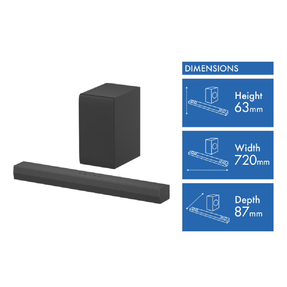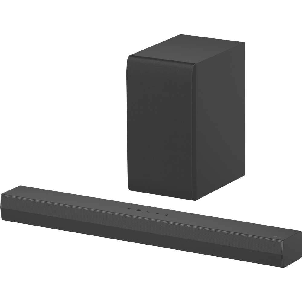 Bring the theater experience straight to your living room with the LG 2.1Ch 300W Soundbar. This sleek black soundbar pumps out room-filling audio with 300 watts of total power through its 2.1-channel speaker configuration. Connect wirelessly via Bluetooth or use the convenient optical and HDMI ports. AI Sound Pro mode analyzes content and optimizes sound settings in real time. Switch between cinema standard and game modes to suit your entertainment. The wireless subwoofer delivers deep thumping bass you can feel. At just 63mm high the soundbar fits neatly under any TV while projecting audio clearly. Control playback and volume with the included remote. Enjoy immersive cinematic audio for movies music and games. This LG soundbar comes with a 1 year manufacturer's warranty for peace of mind. The manufacturer's part number for this product is S40T. Discover crisp powerful sound today with the feature-packed LG 2.1Ch 300W Soundbar.
