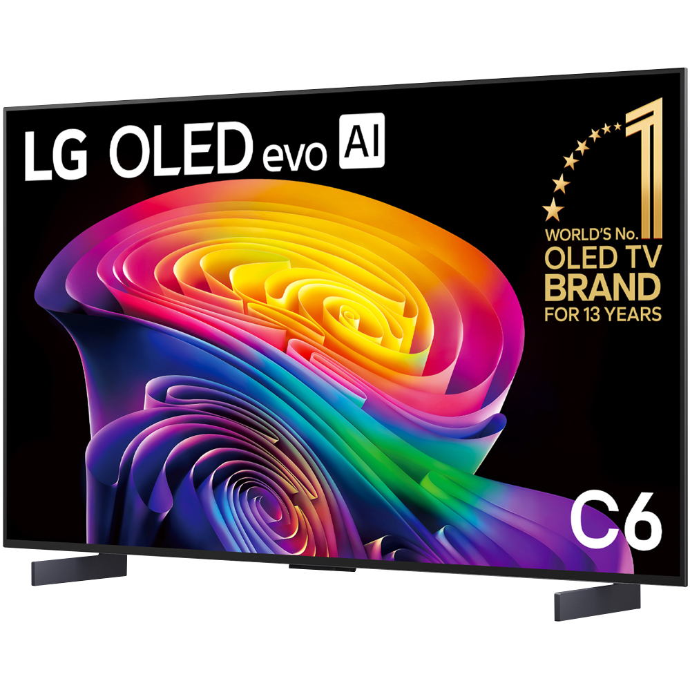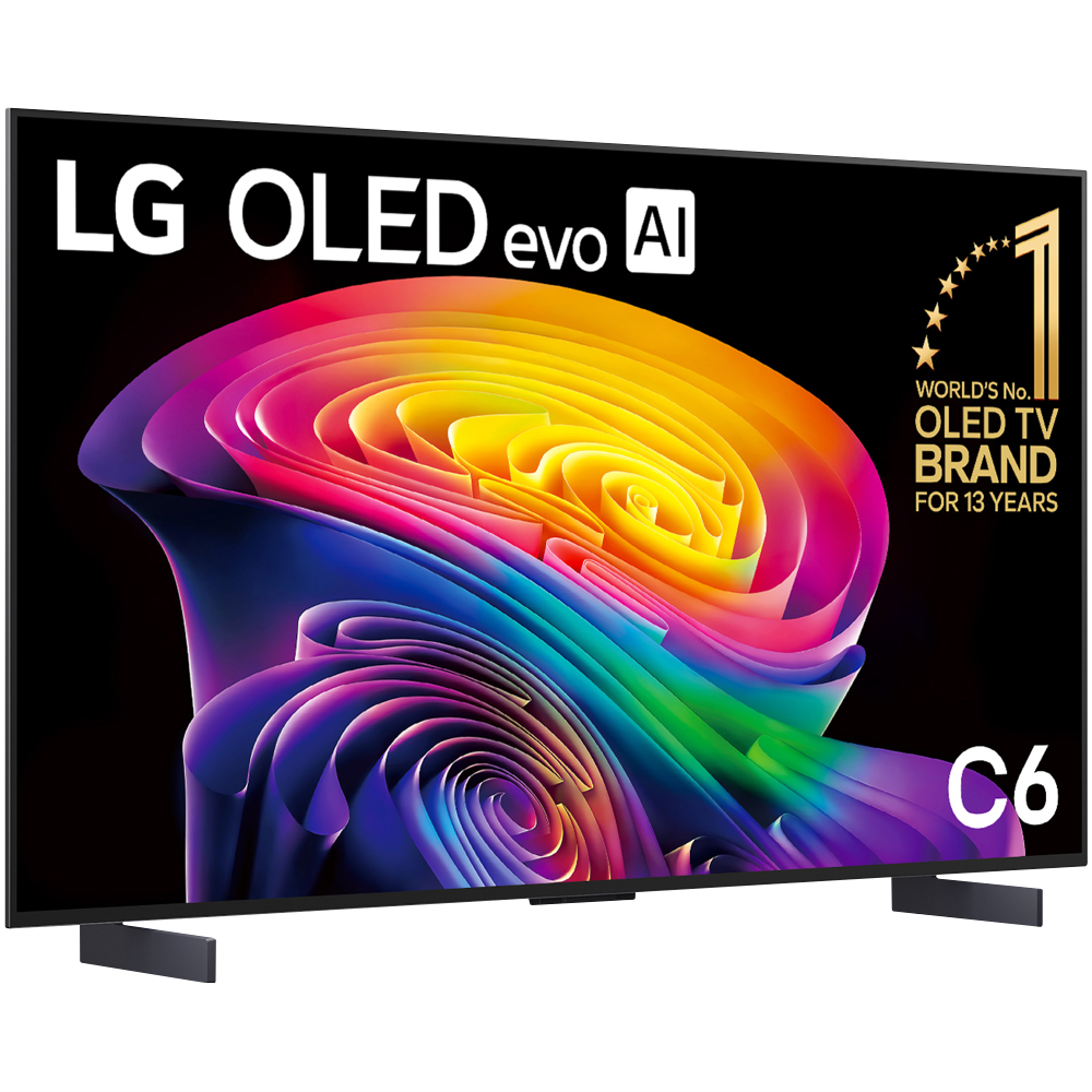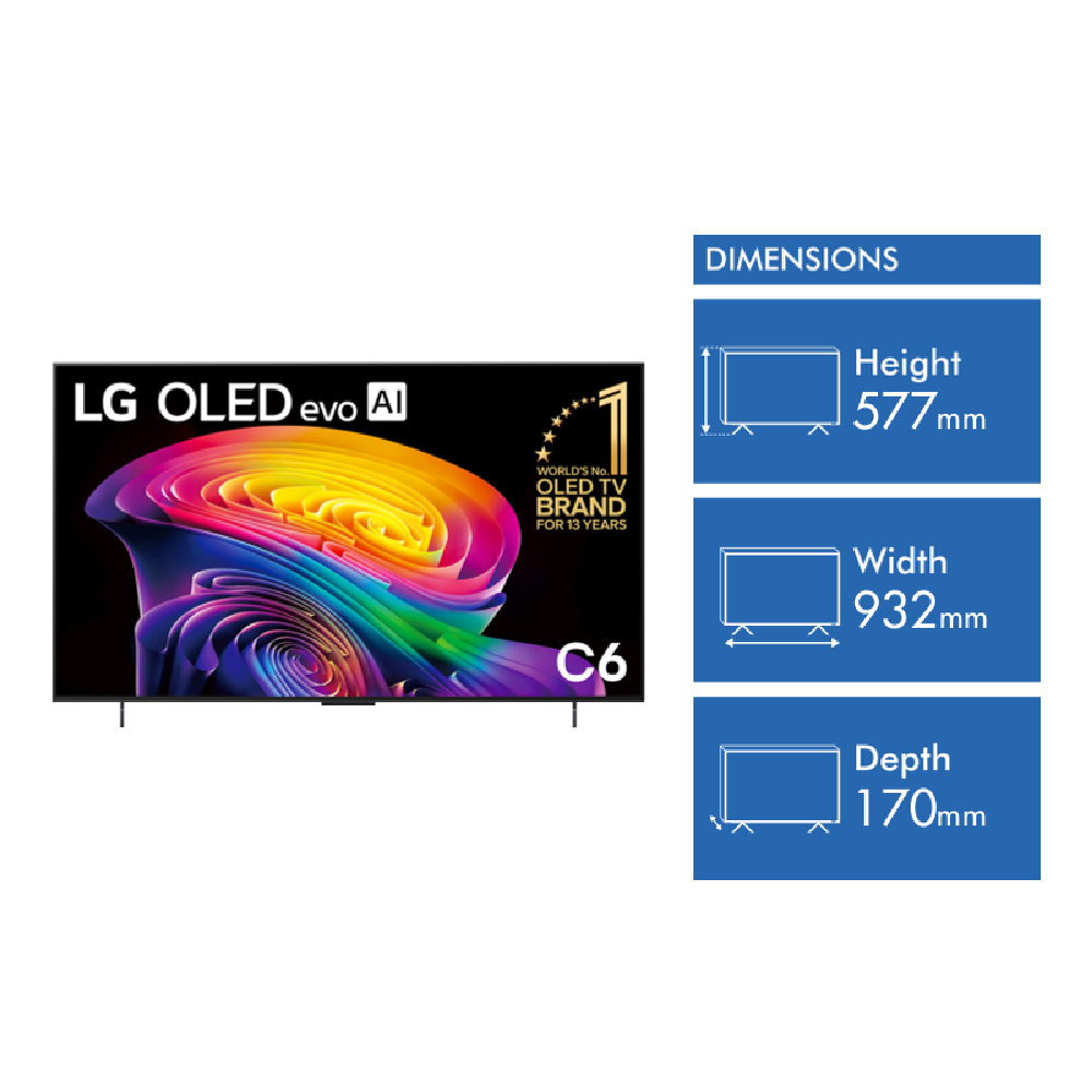 Looking for a TV that makes every night feel like movie night? This 42 inch OLED EVO AI C6 4K Smart TV draws you in with vivid OLED colour and a brightness booster so scenes look crisp even in bright rooms. The 11 AI Processor 4K Gen 3 keeps everything running smoothly while self-lit pixels and Dolby Vision HDR bring your favourite shows to life with rich detail. Gamers will love the up to 165Hz VRR and Nvidia G-Sync compatibility making fast action feel seamless. You can easily stream with Wi-Fi 6E Bluetooth Apple AirPlay and Google Cast plus connect devices using four HDMI 2.1 ports. Enjoy immersive sound with Dolby Atmos and control your TV using ThinQ voice commands. WEBOS 26 gives you access to all your favourite apps from Netflix to Kayo. With a 5 star energy rating you ll save on power while enjoying quality entertainment. The TV stands just 577mm tall and 932mm wide with the stand weighing 10.1kg so it fits comfortably in most spaces. You get a 1 year manufacturer s warranty for peace of mind. Model OLED42C6PSA. Discover how this TV could change the way you watch and play.