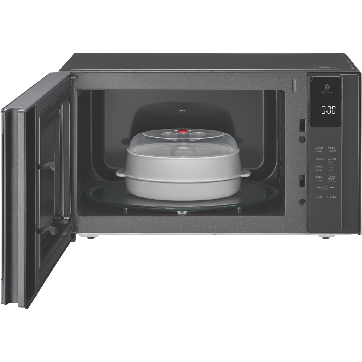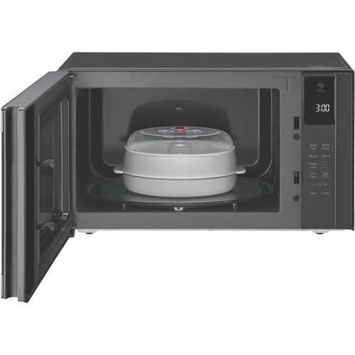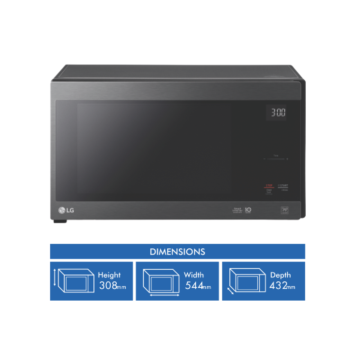 Bring home the latest in microwave oven technology with the LG 42L 1200W NeoChef Smart Inverter Microwave in stylish matte black. This full-sized microwave delivers powerful performance and convenient cooking features to make meal prep a breeze. The generous 42 litre capacity accommodates large family-sized portions while the 1200W power output ensures rapid heating and defrosting. LG's advanced inverter technology maintains a constant temperature when reheating and cooking preventing overcooking. With 10 adjustable power levels you can fine-tune cooking times for different foods. The easy-to-use touch control panel allows quick selection of auto cook menus time and weight defrosting and more. The interior ceramic enamel coating is smooth and easy to clean after cooking. Added conveniences include a child safety lock a steam bowl for healthy cooking and a 360mm glass turntable for even heating. Measuring 544mm wide x 308mm high x 432mm deep and weighing 12.5kg this microwave will look great on your countertop. It comes with a 2 year manufacturer's warranty for peace of mind. The manufacturer's part number for this product is MS4296OMBB. See for yourself how the LG 42L Smart Inverter Microwave can make mealtimes easier.