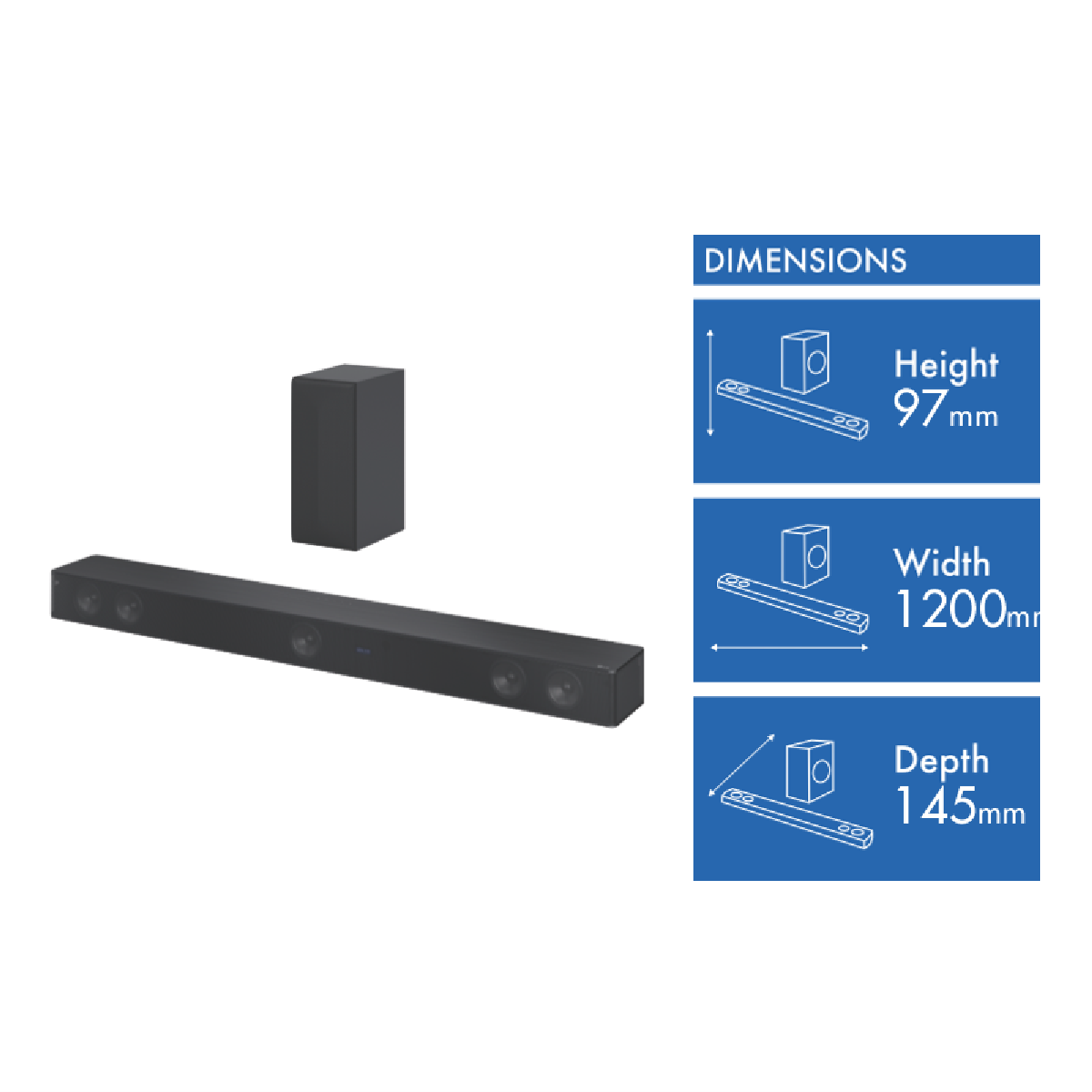 Elevate your home entertainment with the powerful LG 5.1Ch 800W Soundbar. With a sleek black design this soundbar delivers an immersive audio experience thanks to 5.1 channels and a thumping 800W total output. DTS Virtual:X technology transports you right into the action with lifelike surround sound. AI Sound Pro optimizes audio for whatever you're watching. Stream all your favorite music services via Bluetooth 4.2 connectivity. The advanced AI processor enhances audio quality across 6 sound modes. Optical and USB inputs provide seamless device connectivity. At 1200mm wide this soundbar fits perfectly below today's larger TVs. The 5.3kg wireless subwoofer adds deep bass you can feel. With the LG 1 year warranty you can enjoy room-filling sound with confidence. Experience movie magic music and more with the LG 5.1Ch 800W Soundbar. The manufacturer's part number for this product is SH7Q. Bring home cinema sound home today.