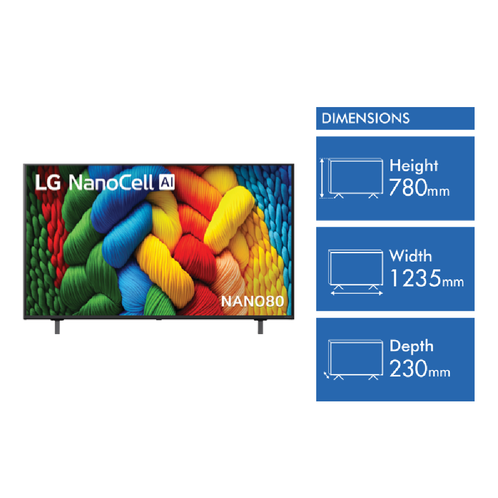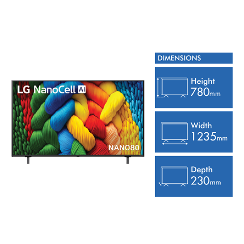This LG 55-inch TV brings the cinema experience home with its stunning 4K Ultra HD resolution. You'll enjoy vibrant colours thanks to NanoCell technology while the a7 AI Processor 4K Gen8 ensures smooth performance. The TV's smart features powered by WEBOS 25 give you access to popular streaming apps like Netflix Stan and Disney+. With HDR10 and HLG support you'll see more detail in bright and dark scenes. The 60Hz refresh rate and 100 motion rate keep fast-moving content looking crisp. Voice control via ThinQ and Microsoft Copilot makes navigation a breeze. This energy-efficient TV boasts a 5-star rating using just 338 kWh per year. Mount it on the wall or use the included stand - either way you're in for a treat. The 55NANO80ASA comes with a one-year warranty for peace of mind.