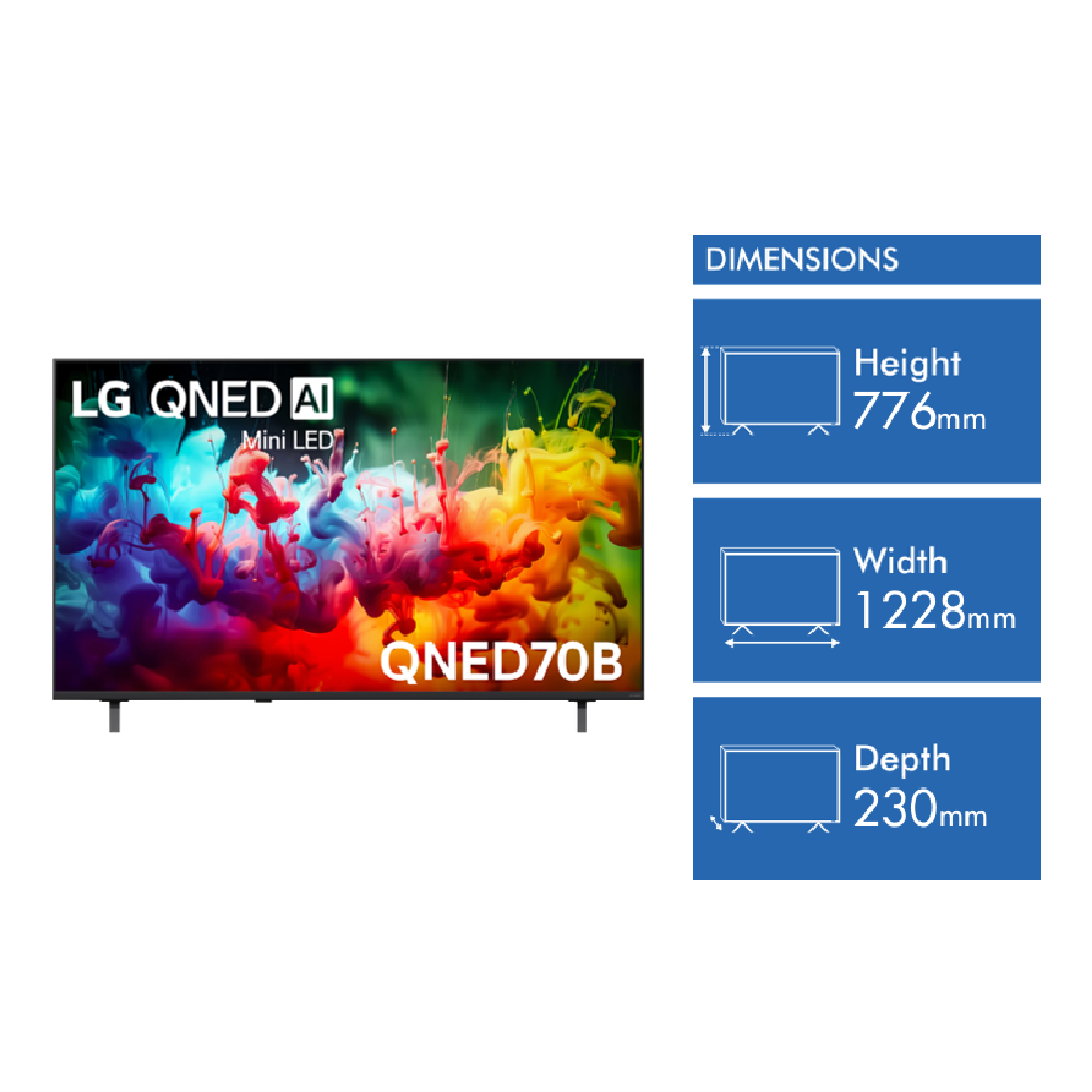 Looking for a TV that makes every night feel like movie night? This 55 inch LG QNED70B AI Mini LED 4K Smart TV brings together vibrant colour sharp detail and smooth motion thanks to its LG QNED screen technology and Mini LED backlighting. With Dynamic QNED Colour and the 7 AI Processor 4K Gen 9 you ll notice lifelike visuals whether you re streaming Netflix or catching up on live sport. HDR10 and HLG formats boost contrast so scenes pop off the screen while 60Hz VRR keeps gaming action steady. Built-in Wi-Fi Bluetooth and Apple AirPlay make connecting devices easy and the WEBOS 26 operating system lets you jump between apps like Stan Disney+ and YouTube in seconds. Dolby Atmos pass through means sound feels immersive especially paired with an LG soundbar. You can control everything with THINQ Voice Control and handy extras like Sports Alert and Home Hub add convenience to your daily routine. The TV s energy rating of 5.5 stars helps keep power bills in check and the included stand remote and safety strap make setup simple. With dimensions of 1228mm wide 776mm high and weighing 9.6kg with the stand it fits comfortably in most living rooms. Enjoy peace of mind with a 1 year manufacturer s warranty. Model 55QNED70BSA. Discover how this TV can change the way you relax and entertain at home.