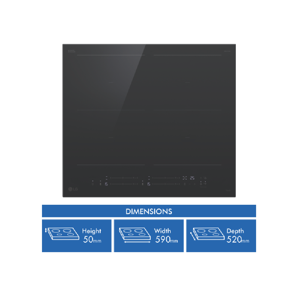 Upgrade your cooking experience with the sleek and powerful LG 60cm Induction Cooktop (BCI607B4BG). This black ceramic glass cooktop boasts four cooking zones giving you ample space to whip up your favourite meals. With 15 power levels and a boost function you can precisely control the heat for perfect results every time. The touch controls make operation a breeze while the cook timer (up to 99 minutes) ensures your dishes are cooked to perfection. Safety features like the child safety lock residual heat indicators and automatic safety switch off give you peace of mind. Plus the ThinQ(Wi-Fi) monitoring and hood pairing capabilities take your cooking to the next level. Measuring 590mm wide 50mm high and 520mm deep this induction cooktop is backed by a 2-year manufacturer's warranty for your confidence. Please note the BCI607B4BG must be installed by a licensed professional. Ready to elevate your culinary creations? Add the LG 60cm Induction Cooktop to your kitchen today.