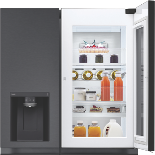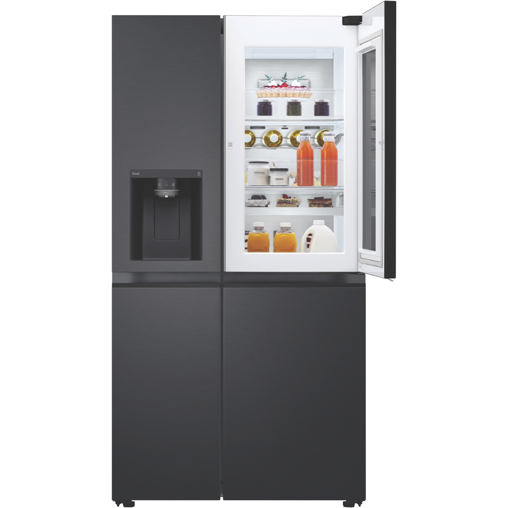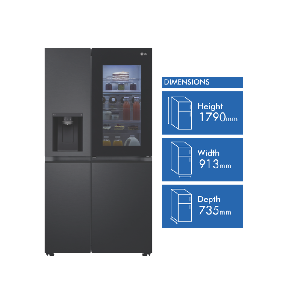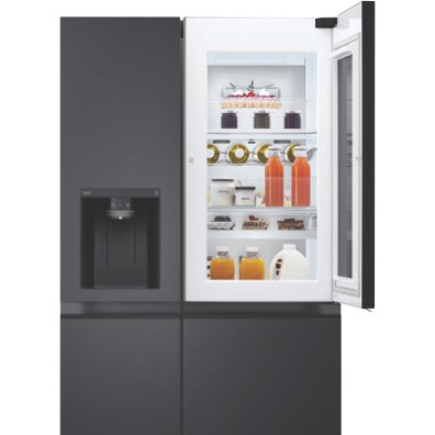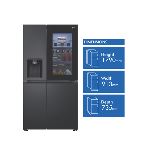 Experience the ultimate in food preservation with the sleek modern LG 635L InstaView SxS Refrigerator. This spacious side by side fridge boasts a total capacity of 635 liters with 416 liters in the fridge and 205 liters in the freezer providing ample storage for the weekly shop. The innovative InstaView door-in-door feature lets you check inside without letting cold air escape while the handy 14L craft ice maker delivers refreshing cubed or crushed ice on demand. With its black matte finish hidden hinge design and clever storage solutions like the adjustable slide-out shelving this energy and water efficient refrigerator adds sophisticated style and convenience to any kitchen. Additional standout features include the UVnano water dispenser for purified water and ice a range of temperature modes and LG's smart diagnosis system for maintenance alerts. Bringing advanced refrigeration technology and intuitive design together in one appliance the LG 635L InstaView Side by Side makes refrigeration a pleasure. The manufacturer's part number for this product is GS-V600MBLC. Make your kitchen complete with the LG 635L InstaView.