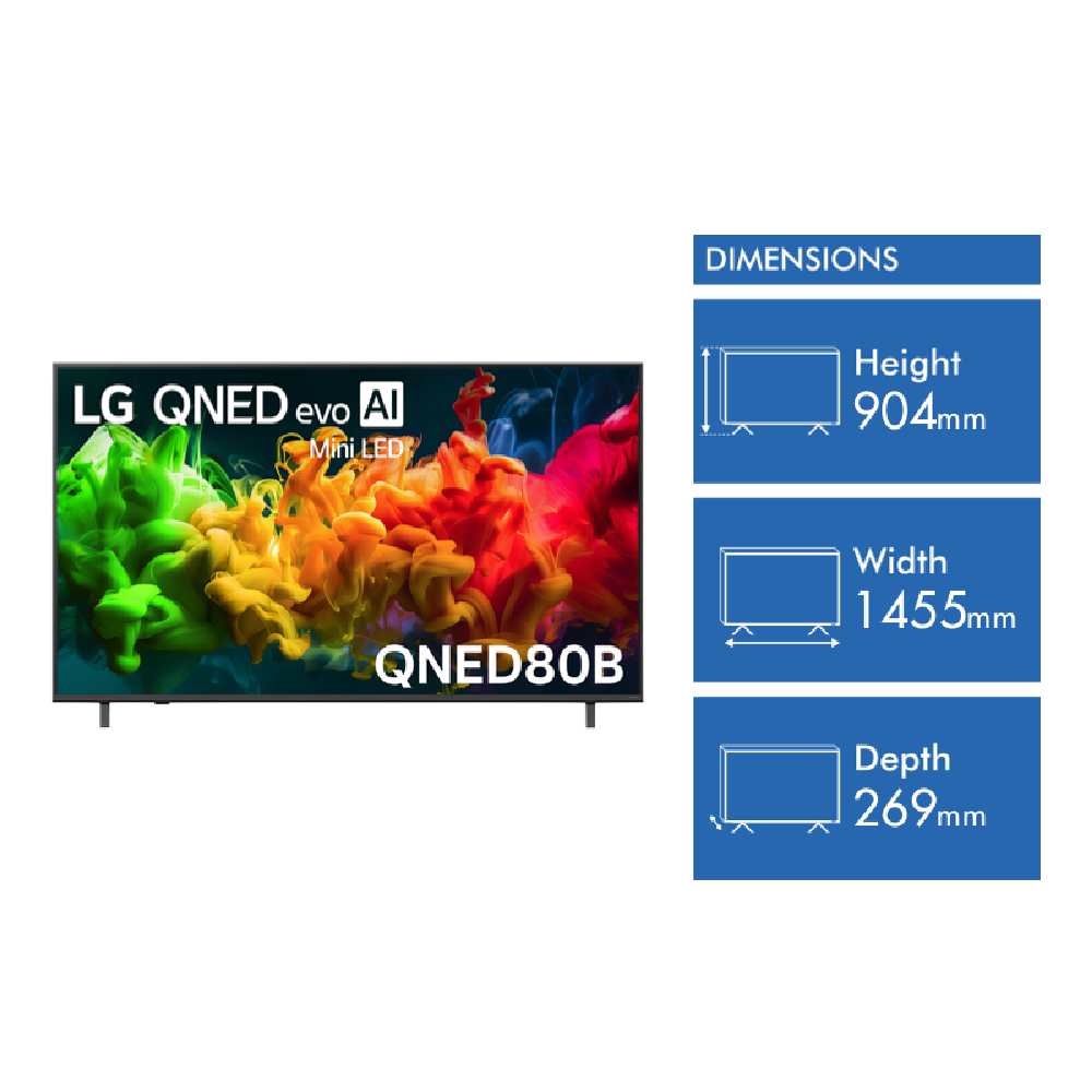 Looking for a TV that brings your favourite shows and games to life? This 65 inch LG QNED80B EVO AI Mini LED 4K Smart TV uses LG QNED evo screen technology and Dynamic QNED Color Pro to deliver vibrant colours and crisp clarity so every scene feels real. The 7 AI Processor 4K Gen 9 works behind the scenes to enhance picture quality while Mini LED backlighting ensures deeper blacks and brighter highlights. With HDR10 and HLG support you ll notice extra detail in both dark and bright moments. Gamers will appreciate the 60Hz VRR and upscaling features making fast-paced action smooth and sharp. Connect wirelessly with Wi-Fi 5 Bluetooth 5.3 Apple AirPlay and Google Cast or plug in devices using three HDMI ports and USB. Enjoy Dolby Atmos pass-through for immersive sound and control everything easily with ThinQ voice assistant. You can stream from Stan Netflix Apple TV+ Prime Video Disney+ and more so there s always something to watch. The TV s energy rating of 4.5 stars helps keep power bills in check. Measuring 1455mm wide and weighing 17kg with the stand it fits nicely in most living rooms. A 1 year manufacturer s warranty gives you peace of mind. Model 65QNED80BSA. Discover how this TV can change your viewing experience.