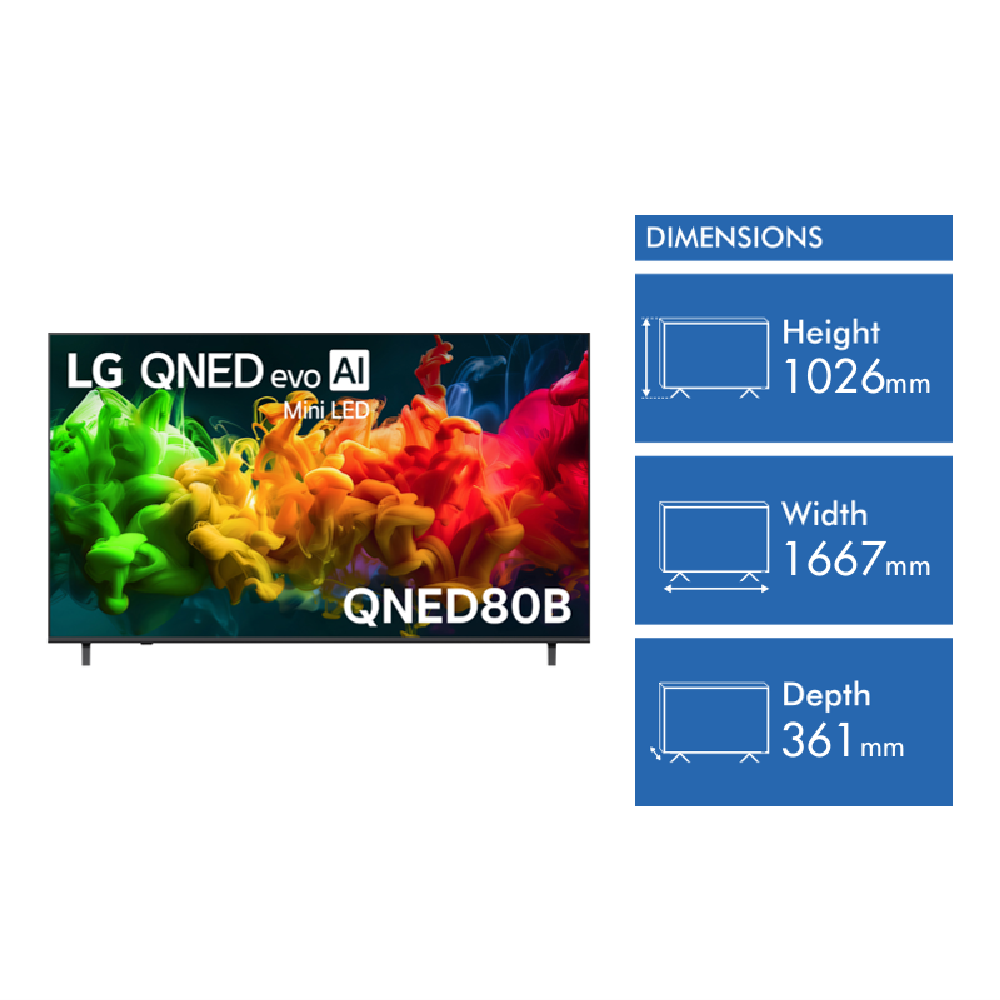 Looking for a TV that makes your lounge room feel like a cinema? This 75 inch LG QNED80B EVO AI Mini LED 4K Smart TV brings you vivid colour and sharp detail thanks to Dynamic QNED Color Pro and Mini LED backlighting. Imagine watching your favourite shows or sports with lifelike clarity powered by the 7 AI Processor 4K Gen 9 and HDR10 support. You can stream Netflix Stan Apple TV+ and more or mirror screens wirelessly from your devices. With 60Hz VRR and upscaling gaming and fast action look smooth and clear. Dolby Atmos pass-through means sound matches the visuals and you get handy extras like Sports Alert Home Hub and Google Gemini. Energy efficiency is covered with a 5 star rating so you can enjoy big entertainment without worrying about your power bill. The TV comes with a stand remote batteries and safety strap and is easy to mount with a 300x200 VESA setup. Dimensions with the stand are 1026mm high 1667mm wide and 361mm deep weighing 21.6kg. You re covered by a 1 year manufacturer s warranty. Model 75QNED80BSA. Enjoy a new way to watch and connect.