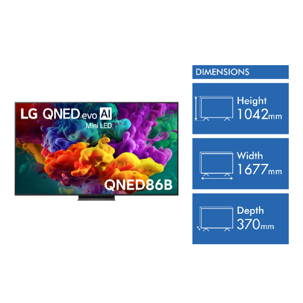 Imagine watching your favourite shows on a massive 75 inch LG QNED evo screen where every scene bursts with vibrant colour thanks to Dynamic QNED Color Pro and Mini LED advanced local dimming. Wondering how smooth sports or gaming can look? With a 120Hz refresh rate and up to 144Hz VRR you ll see action unfold clearly backed by FreeSync Premium for seamless play. The 8 AI Processor 4K Gen 3 brings sharp detail and lifelike clarity while Dolby Vision HDR10 and HLG ensure rich contrast. Enjoy immersive sound with Dolby Atmos Flexconnect and connect easily using Wi-Fi 5 Bluetooth 5.3 Apple AirPlay Google Cast or Windows Screen Mirroring. Built-in smart features like WEBOS 26 ThinQ voice control and compatibility with popular streaming apps simplify your viewing. You ll also appreciate a strong 7 star energy rating keeping power use low. The TV s dimensions with stand are 1042mm high 1677mm wide and 370mm deep weighing 41kg so it fits comfortably in most lounge rooms. A one year manufacturer s warranty gives peace of mind. Model 75QNED86BSA. Enjoy clearer entertainment and smarter living every day.