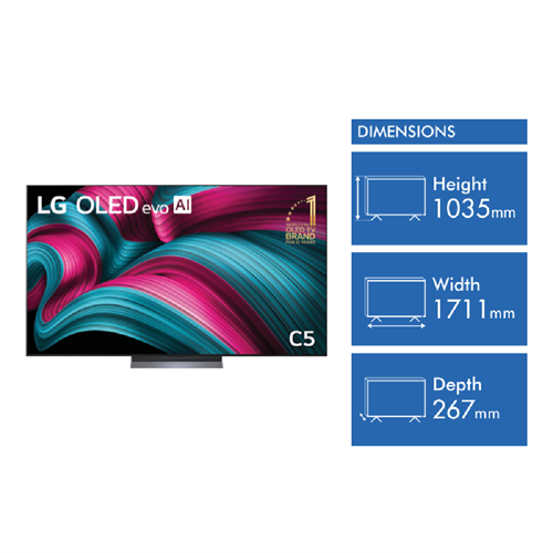 Experience cinema-quality visuals at home with this LG 77 OLED EVO C5 TV. The massive 77-inch screen with 4K Ultra HD resolution (3840 x 2160) brings movies and shows to life with stunning clarity and vibrant colours. Powered by the a9 AI Processor 4K Gen8 it delivers smooth motion and upscales content beautifully. Gamers will love the 120Hz refresh rate and 1ms response time for lag-free play. The TV supports Dolby Vision and Dolby Atmos for immersive audio-visual experiences. Smart features include WEBOS 25 and voice control via ThinQ or Microsoft Copilot. With a 5-star energy rating it's efficient too. Mount it on the wall or use the included stand - either way this OLED evo TV will be the centrepiece of your living room. The LG OLED77C5PSA comes with a 1-year manufacturer's warranty for peace of mind.