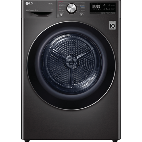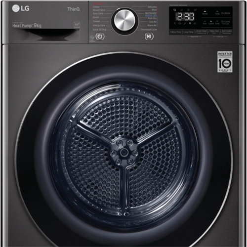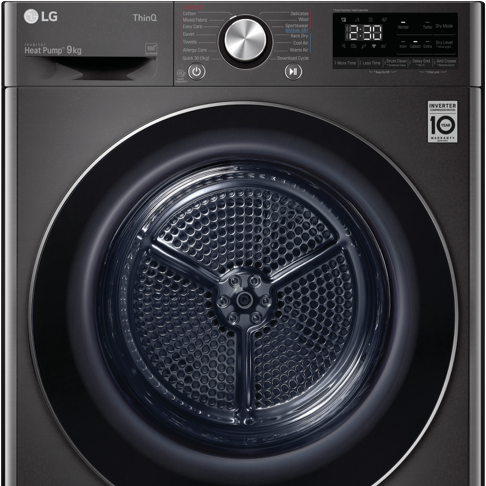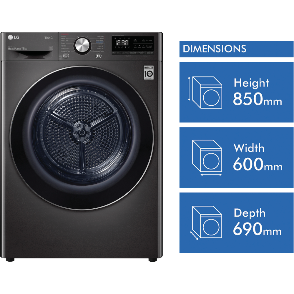 Equipped with LG's Inverter Compressor and heat pump technology to make a Super-Efficient 9 Star Energy Rating possible this LG Heat Pump Dryer DVH9-09B offers both energy savings and optimal care of clothing in a 9kg capacity stainless steel drum. A heat pump dryer dries fabrics carefully and efficiently and does not require venting to the outside so they're perfect if you're renting. This LG dryer is designed to care for what you wear with Sensor Dry cycles including Allergy Care Easy Care Wool or Delicates for dedicated fabric treatment with no overdrying. Select a Time Dry cycle like Rack Dry in conjunction with the included Drying Rack for drying off wet hats scarves or shoes. Its clever Auto Cleaning Condenser removes lint and dirt with its automatic condenser clean function; ensuring your dryer runs both optimally and hygienically. Plus with LG ThinQ with Smart Pairing* this LG heat pump dryer automatically sets the best dry cycle based on the last wash in your connected LG front load washer. It is 850mm high 600mm wide and 690mm deep so take careful measurements of where your dryer needs to fit leaving enough room for the door to open. *Compatible smartphone required Android 4.1.2 (JellyBean) or later or iOS 9 or later required for LG ThinQ application.