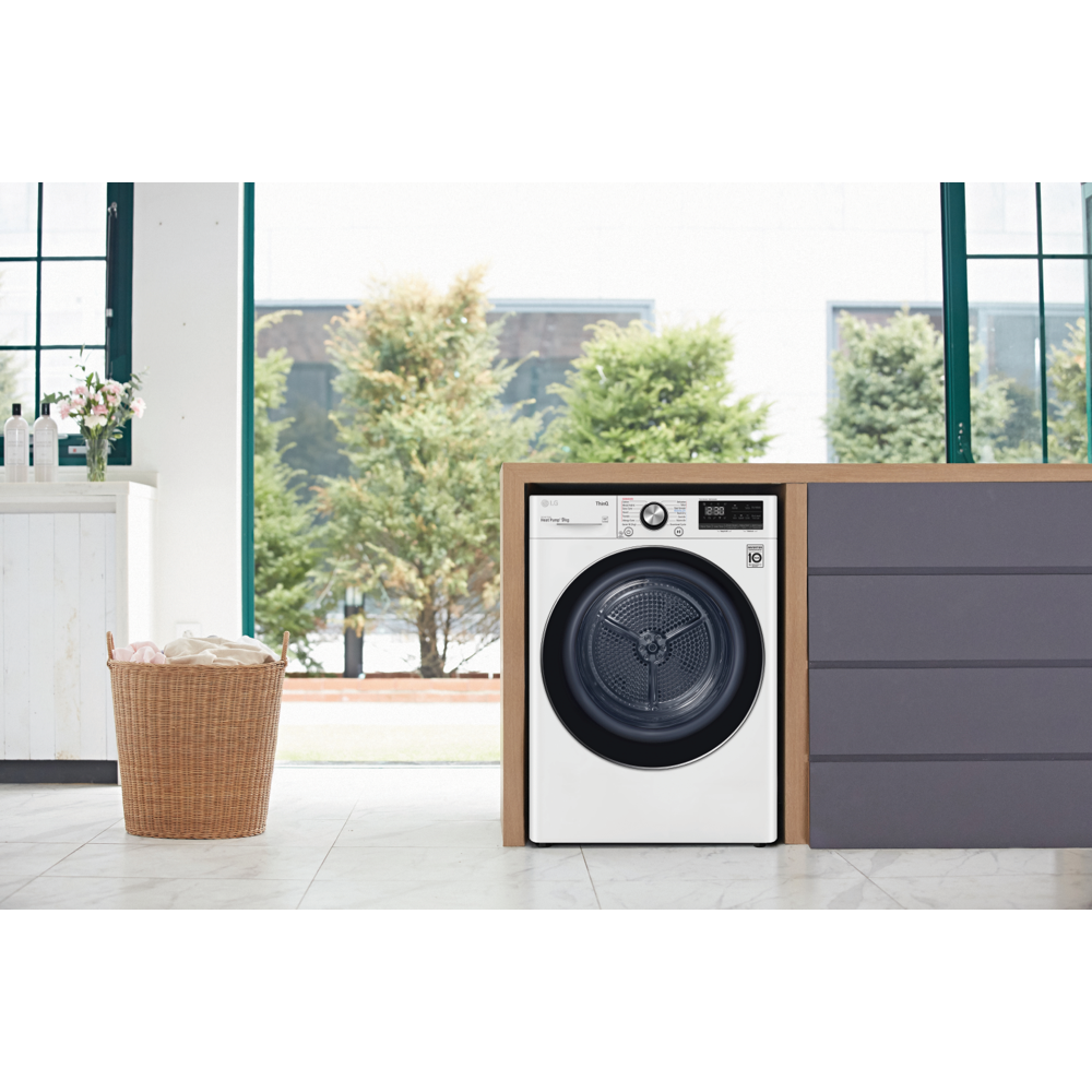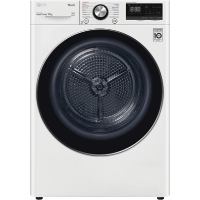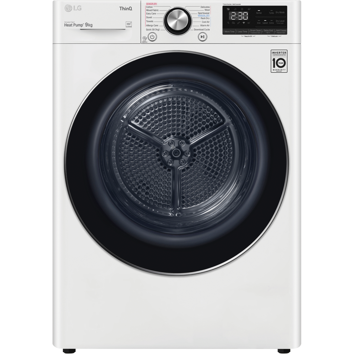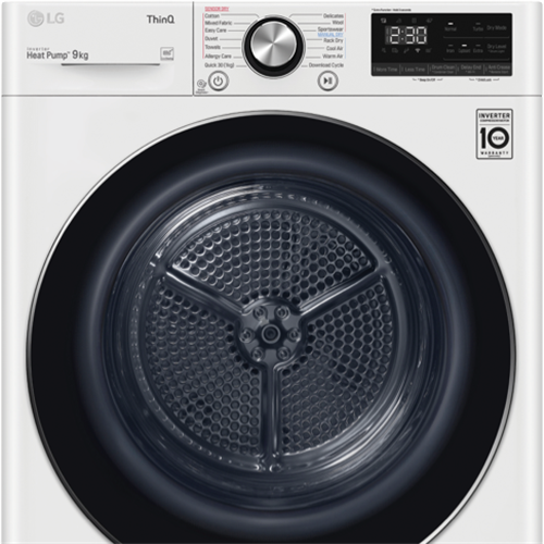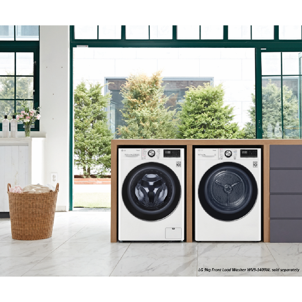 Equipped with LG's Inverter Compressor and heat pump technology to make a Super-Efficient 9 Star Energy Rating possible this LG Heat Pump Dryer DVH9-09W offers both energy savings and optimal care of clothing in a 9kg capacity stainless steel drum. A heat pump dryer dries fabrics carefully and efficiently and does not require venting to the outside so they're perfect if you're renting. This LG dryer is designed to care for what you wear with Sensor Dry cycles including Allergy Care Easy Care Wool or Delicates for dedicated fabric treatment with no overdrying. Select a Time Dry cycle like Rack Dry in conjunction with the included Drying Rack for drying off wet hats scarves or shoes. Its clever Auto Cleaning Condenser removes lint and dirt with its automatic condenser clean function; ensuring your dryer runs both optimally and hygienically. Plus with LG ThinQ with Smart Pairing* this LG heat pump dryer automatically sets the best dry cycle based on the last wash in your connected LG front load washer. It is 850mm high 600mm wide and 690mm deep so take careful measurements of where your dryer needs to fit leaving enough room for the door to open. *Compatible smartphone required Android 4.1.2 (JellyBean) or later or iOS 9 or later required for LG ThinQ application.