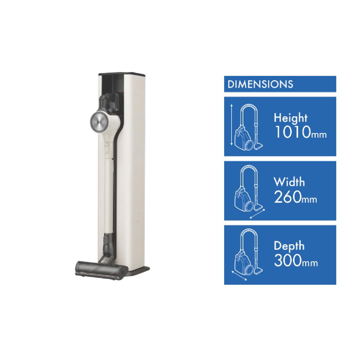 The LG A9 CordZero Multi Stick Vacuum A9N-MULTI is an all in one vacuum solution for any home. Never accidentally get dust back into the room with the All-In-One Tower automatically disposing of dust in the vacuum to the dust storage bag(1) that can then be hygienically replaced once full. 3 Step Filtration locks away dirt and dust within the tower that can also store accessories and charge batteries in one unit. Two batteries are included and are interchangeable on the fly for up to 120 minutes(2) of run time. Easily control while vacuuming with Thumb Touch controls to turn up the power or power down after a thorough clean. The brushless Smart Inverter Motor spins rapidly to generate internal cyclonic airflow separating and filtering dust and is covered with a long term 10 year parts warranty(3). 5 Step Filtration within the vacuum captures 99.97% of particles as small as 0.3 microns in size(4) and the filters can be washed and dried for longer service life and less replacements. Kompressor technology compresses dust and hair in the internal chamber for up to 2.4 times the uncompressed capacity(5). Connect the vacuum to LG's ThinQ app(6) to monitor and maintain the status of the filter let you know when the battery is fully charged run diagnosis and more. Disclaimers: (1) Additional replacement dust storage bags (V-DUSTBAG) sold separately. (2) Up to 120min run time when using 2 batteries vacuum set to starting normal mode without Power Drive Nozzle. Actual run time may vary when using attachments and depending on the operating environment and settings. Vacuum to be placed on dock and battery in designated slot for simultaneous charging. (3) 12 month batteries warranty 2 years parts and labour + 8 additional years on motor (parts only). (4) Tested to ASTM F1977-04(2017) Filtration Efficiency of a Vacuum Cleaner System Standards in Turbo (Max) Mode. Actual filtration efficiency may vary depending on the operating environment. (5) Based on LG internal testing results observed by Intertek. A9 Kompressor receptacle capacity was tested on Turbo mode. Cat hair (Maine Coon) was suctioned and compressed by the manual compression function repeatedly until it reached the receptacle capacity. Compression efficiency 2.4x was calculated by comparing the weight of compressed cat hair with the weight of non-compressed cat hair (both with the same volume). Actual receptacle capacity (compression efficiency) may vary depending on operating environment. (6) Compatible smartphone Android 4.1.2 (JellyBean) or later or iOS 9 or later) required for LG ThinQ® app. Mobile and Home Wi-Fi Data connection required.