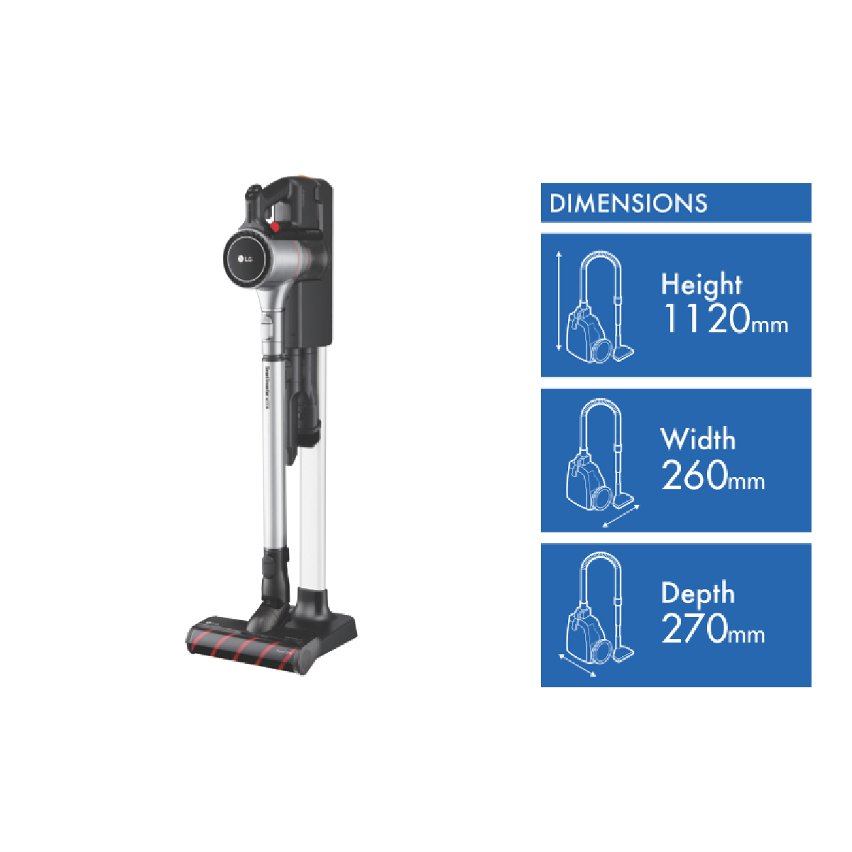 Cleaning becomes less of chore with A9K-EVOLVE Stick Vacuum. With the addition of a mechanism in the dustbin that compresses dust and debris to fit up to 2.4 times more dust and hair(1) to give you more cleaning time in-between trips to the bin. Powerful suction with the Smart Inverter(t) Motor and Axial Turbo Cyclone helps deliver powerful long lasting suction. An upgraded five-step filtration system that includes a HEPA filter to capture fine dust and dirt and a washable filter aids in keeping this LG stick vacuum running hygienically and efficiently. Now with WiFi connectivity you can link your A9 Kompressor to the LG ThinQ app to easily check your cleaning history and simply diagnose issues all from your smartphone(3). Up to 120 minutes run time with the Dual PowerPack(2). Disclaimers: (1) Up to 2.4 times more hair and dust compared to the uncompressed capacity. Results may vary depending on operating environment. (2) Up to 120 minutes run time when using 2 batteries in starting 'normal' mode without Power Drive Nozzle. Battery life may vary depending on the operating environment and settings. (3) Compatible mobile phone required (Android 4.1.2(JellyBean) or later or Apple iOS 9 or later). Mobile and Home Wi-Fi Data connection required.