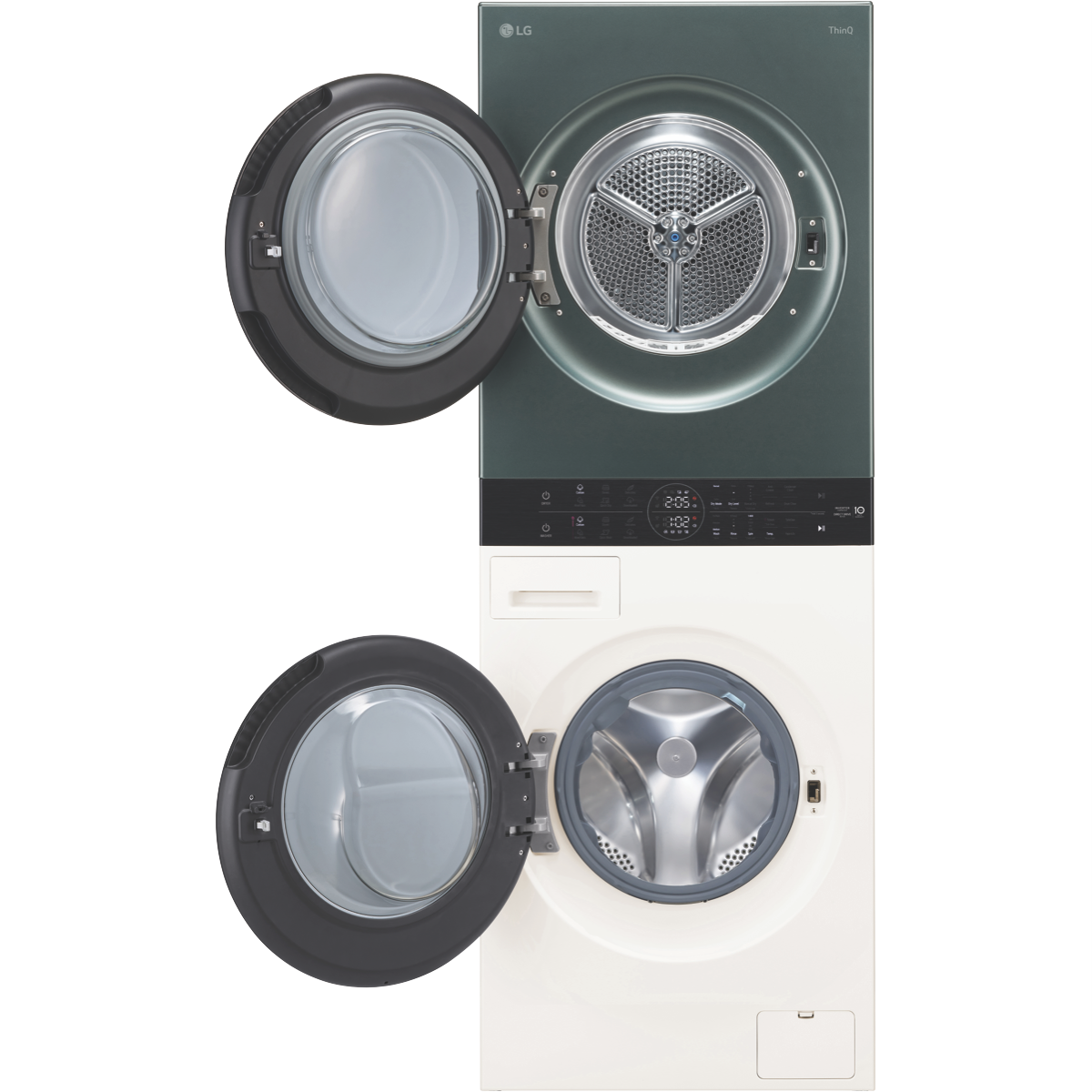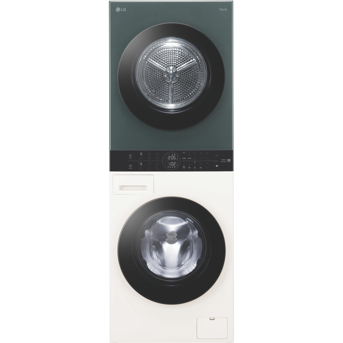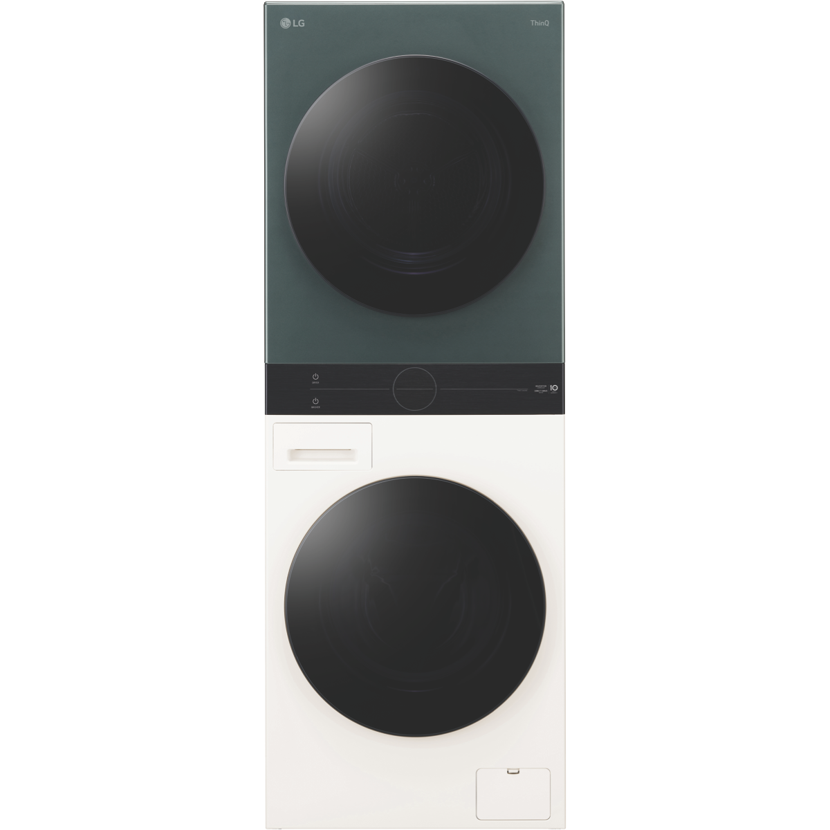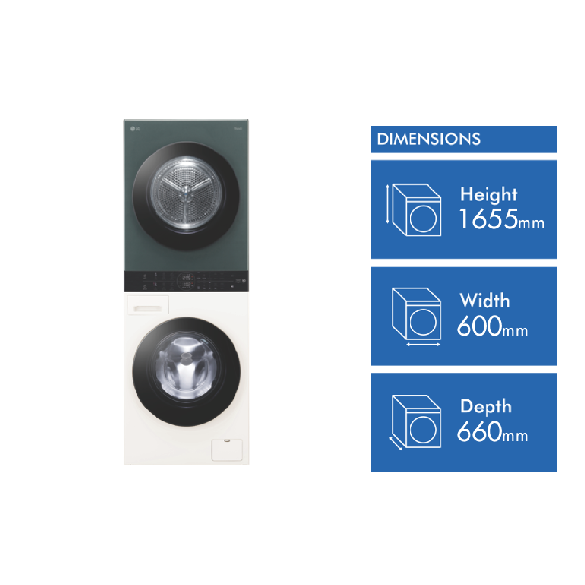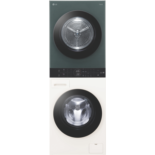 Revolutionize your laundry with the forest green and beige LG WashTower 12kg-9kg combo washer dryer. This innovative front loading washing machine duo boasts a generous 12kg washing capacity and 9kg drying capacity perfect for tackling multiple loads of washing for a large household in one go. With a range of useful programs like Cotton Delicates and Mixed Fabrics you'll enjoy customized cleaning for all your laundry needs. The rapid 2 minute wash cycle lets you refresh garments in a flash while the AI Direct Drive motor provides quiet yet powerful cleaning action. Smart features like Wi-Fi connectivity and remote control through the LG ThinQ app offer advanced convenience. TurboWash 360° technology jets water from multiple angles to penetrate deep into fabrics. This washer dryer makes laundry simple with its intuitive controls variable spin and wash temperatures and steam functions. Conserve water with the 4.5 star WELS water rating. Save power costs and reduce your environmental impact with the impressive 5 star energy rating for washing and 9 stars for drying. The manufacturer's part number for this product is WWT-1209FGB. With its superior cleaning performance smart capabilities and energy efficiency this LG washer dryer combo is the ultimate laundry solution.