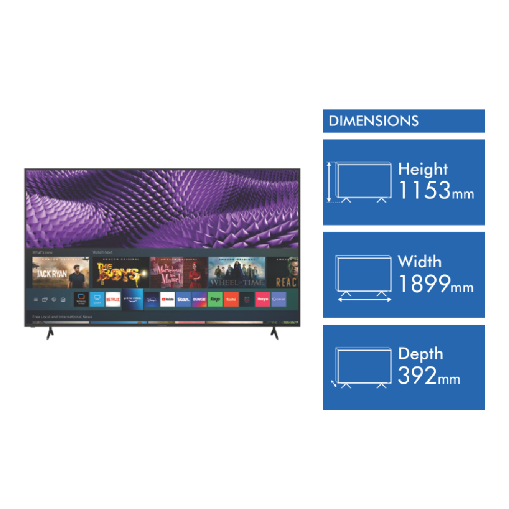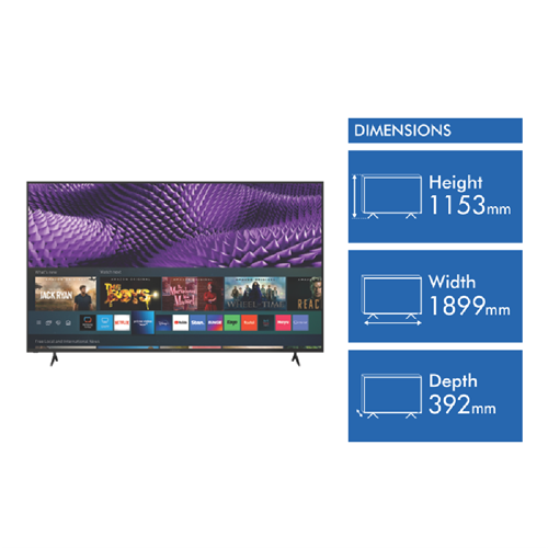 The Linsar 85 4K UHD Smart Tizen TV 2022 LS85UHDZEN could be the best value in its class powered by Tizen which is owned by over 190 million users across the world. Enjoy an immersive experience with High Dynamic Range HDR accentuating the darkness of blacks and intensity of whites for lifelike viewing (1). Tizen OS is a leading experience in TVs a centrepiece of your home viewing experience providing access to content beyond just simple streaming services and multiple smart home device connections. Instantly access your favourite apps with a single quick access button press or control the show with the built-in voice assistant (2). Samsung TV Plus is included at no extra cost and contains a catalog of live content around news sports gaming cooking and kids programs. Disclaimers: (1) Image quality dependant on source material. (2) Service may not be available at time of purchase and may be received later via an Over The Net update