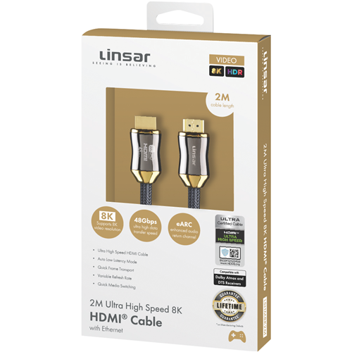With a transfer speed of 48Gbps this 2-metre Linsar 8K High Speed HDMI Cable delivers ultra high data transfer for seamless 8K video resolution viewing. Its HDMI Ultra High Speed connectors allow you to immerse yourself in incredibly sharp 8K images with smooth playback and no dropped frames. Step into the future of television with four times the clarity of 4K. This cable's high bandwidth capacity and advanced HDMI specification effortlessly handles 8K video at 60Hz with 48Gbps across all channels. Experience your favourite movies shows and games in jaw-dropping detail. Whether you're watching documentaries action films or playing the latest visually stunning video games this cable renders every pixel in superb fidelity. With backwards compatibility it also supports lower resolutions like 4K and 1080p. Constructed using quality materials for reliability this HDMI lead is ideal for connecting 8K compatible TVs projectors Blu-ray players and more. The manufacturer's part number for this product is LSHM8K2M. Bring 8K into your home cinema and unlock entertainment's cutting edge technology today.