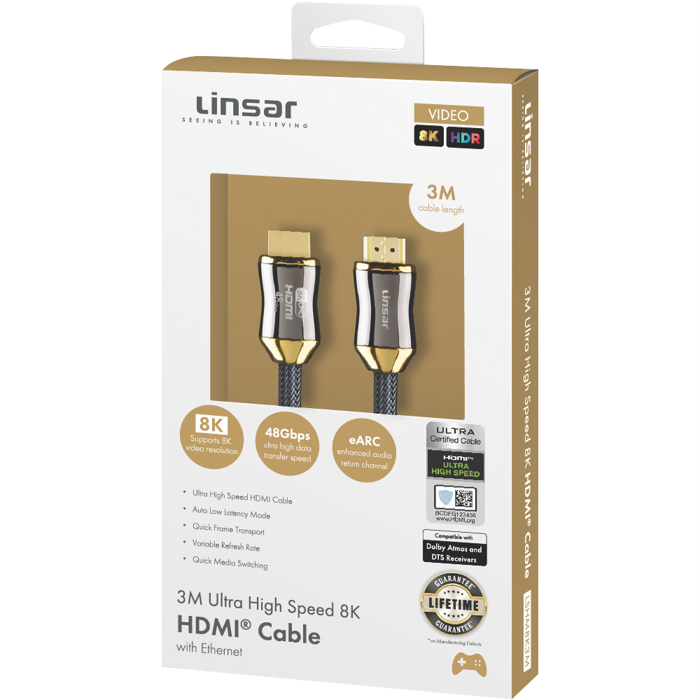 Get the most out of your home entertainment setup with the Linsar 8K High Speed HDMI Cable. This 3 metre cable provides an ultra high speed 48Gbps data transfer rate for smooth 8K video playback without compromising on picture quality. With HDMI 2.1 compatibility you can enjoy the benefits of high resolution 8K visuals 4K video at 120Hz eARC and more. Constructed with premium quality materials for long-lasting durability the Linsar cable ensures your devices stay connected without any unwanted interruptions. Experience the latest in AV technology and upgrade your system with the convenience of a 3 metre cable designed for easy installation behind your TV unit or home theatre setup. For those seeking top-tier performance the Linsar 8K HDMI cable delivers exceptional speeds and reliability. The manufacturer's part number for this product is LSHM8K3M. Discover the difference an ultra high speed HDMI cable makes today.