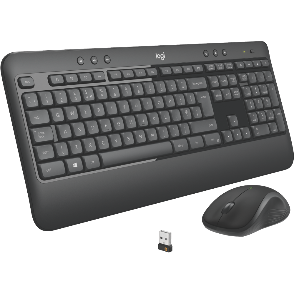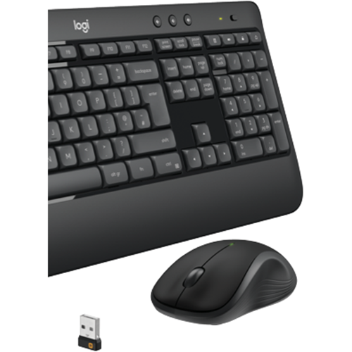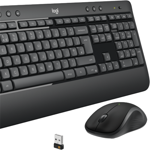Work and play in wireless comfort with the Logitech MK540 Advanced keyboard and mouse combo. This sleek black keyboard and mouse set connects via Logitech's Unifying receiver for a dependable wireless connection up to 10m away. The full-size keyboard features membrane keys for quiet responsive typing. With 18 months of battery life you'll enjoy over a year of uninterrupted productivity. The contoured mouse glides smoothly and fits comfortably in either hand. Enjoy advanced features like programmable keys to simplify tasks and reduce strain. The plug-and-play MK540 allows you to get working quickly thanks to its familiar layout and instant device recognition. Weighing just 633g and 73.5g respectively the slim keyboard and mouse are easy to transport. Measuring 193.5 x 457.3 x 24mm the keyboard is compact yet provides a comfortable typing experience. At 61.8 x 39.2 x 11.5mm the streamlined mouse is ideal for travel and storage. With a 1 year warranty this Logitech keyboard and mouse set provides a complete solution for work and entertainment. The manufacturer's part number for this product is 920-008682. Check out the MK540 Advanced Wireless Keyboard and Mouse to boost your productivity today.