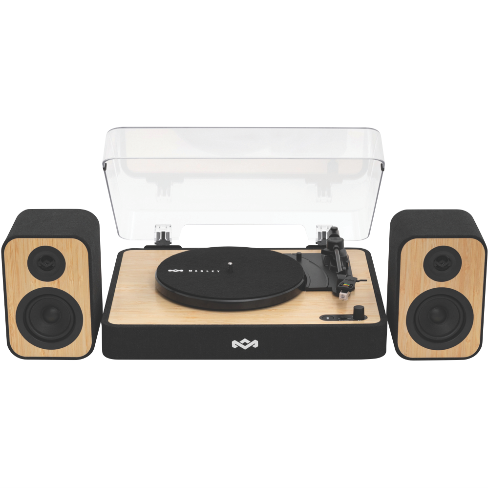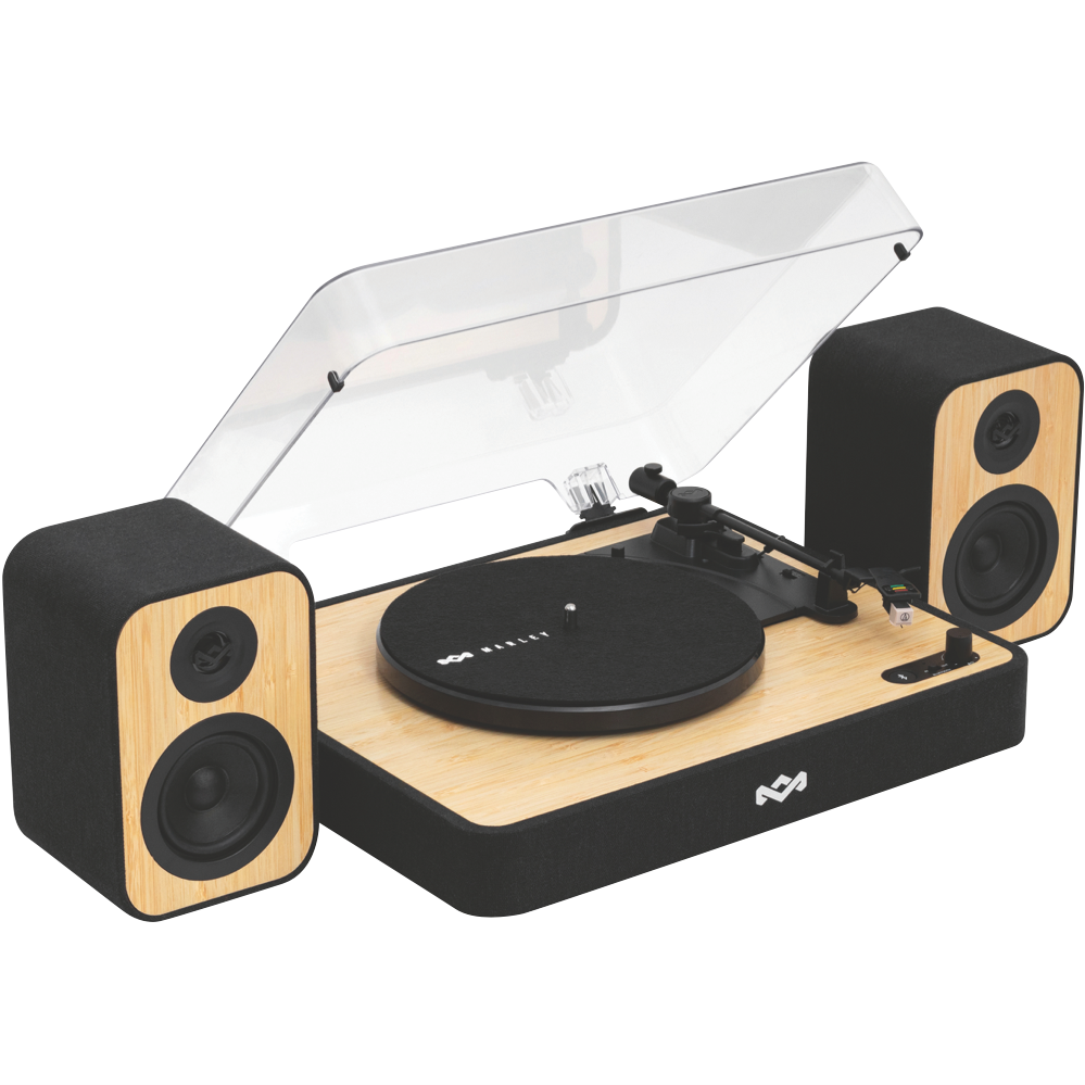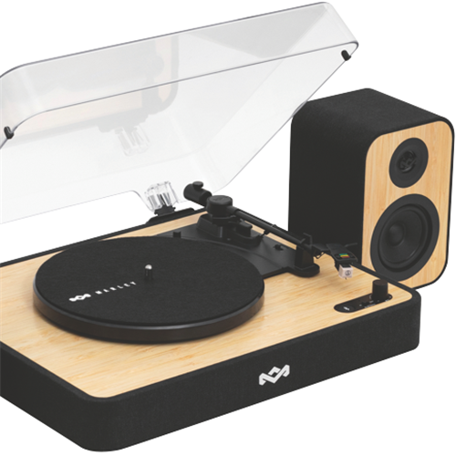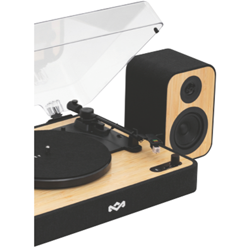 Spin your favorite records with style using the Marley Revolution Turntable. This belt-driven turntable plays 33 45 and 78 RPM records while built-in Bluetooth lets you stream music wirelessly to the included speakers. The aluminum tonearm with an Audio Technica AT3600L cartridge and carbon fiber cantilever conical stylus ensures high-quality sound. A DC servo-controlled motor keeps wow and flutter under 0.3% and maintains a signal-to-noise ratio of 50 dB. The bamboo finish adds a touch of natural elegance to this turntable system. Manufacturer's part number: EM-JT304-SB. Comes with a 2-year warranty.