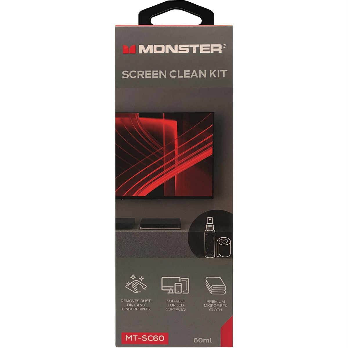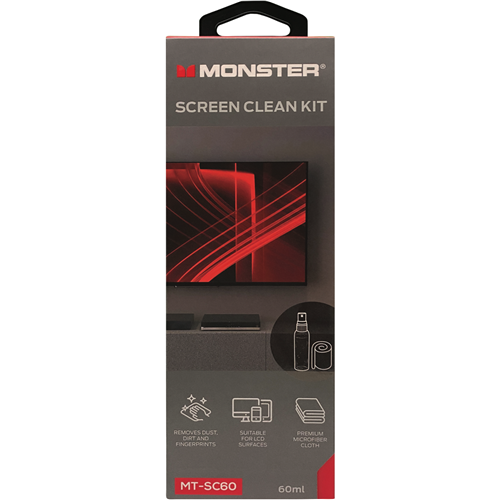A high-quality screen care kit designed to keep your TV looking its best. This Monster premium kit contains everything needed for easy cleaning and protection of your TV screen. The 60ml anti-static spray lifts dust while preventing new dust from sticking. The soft microfibre cloth safely wipes away dirt and fingerprints without scratching. The screen wipe cloths are machine washable for repeated use. With regular use you'll enjoy vibrant colours and sharp images. The handy carry case keeps the kit organised for quick access. Backed by Monster's 2 year warranty this kit has your TV screen covered. Give your TV the care it deserves for long-lasting high definition viewing. The manufacturer's part number for this product is MTSC60. Keep your TV screen looking its best with this premium care kit.