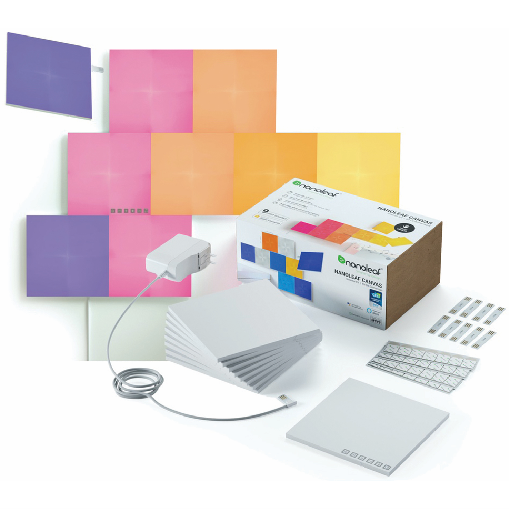 Transform any room into a vibrant light show with the Nanoleaf Canvas Smarter Kit. These modular LED light panels connect together to create stunning displays across your walls. With 16.7 million colors and 25W power you can customize your lighting experience. Sync lights to music or let them dance to their own rhythm. Control lights via app voice assistant or touch gestures on the panels. Expand your setup with up to 500 additional light squares that link together. Made for creative minds the Canvas brings imagination to life. Mount panels with ease using the included double-sided tape. Everything needed is inside the box - 9 light squares 1 control square power supply and linkers to connect them. With a 1 year warranty Nanoleaf stands behind their innovative product. Bring dynamic interactive illumination to your home with the Nanoleaf Canvas Smarter Kit. The manufacturer's part number for this product is NL29-0005SW-9PK.