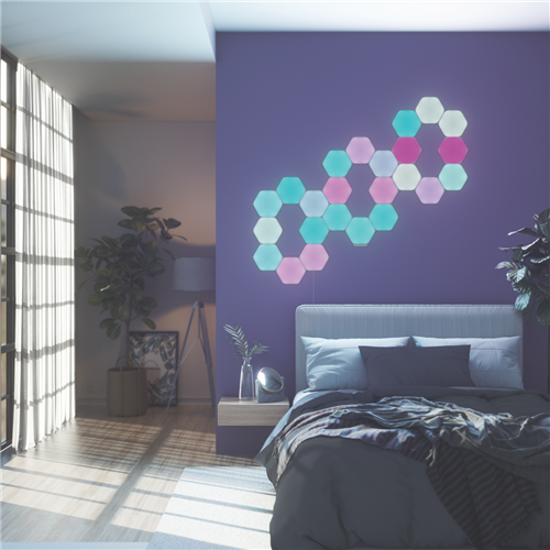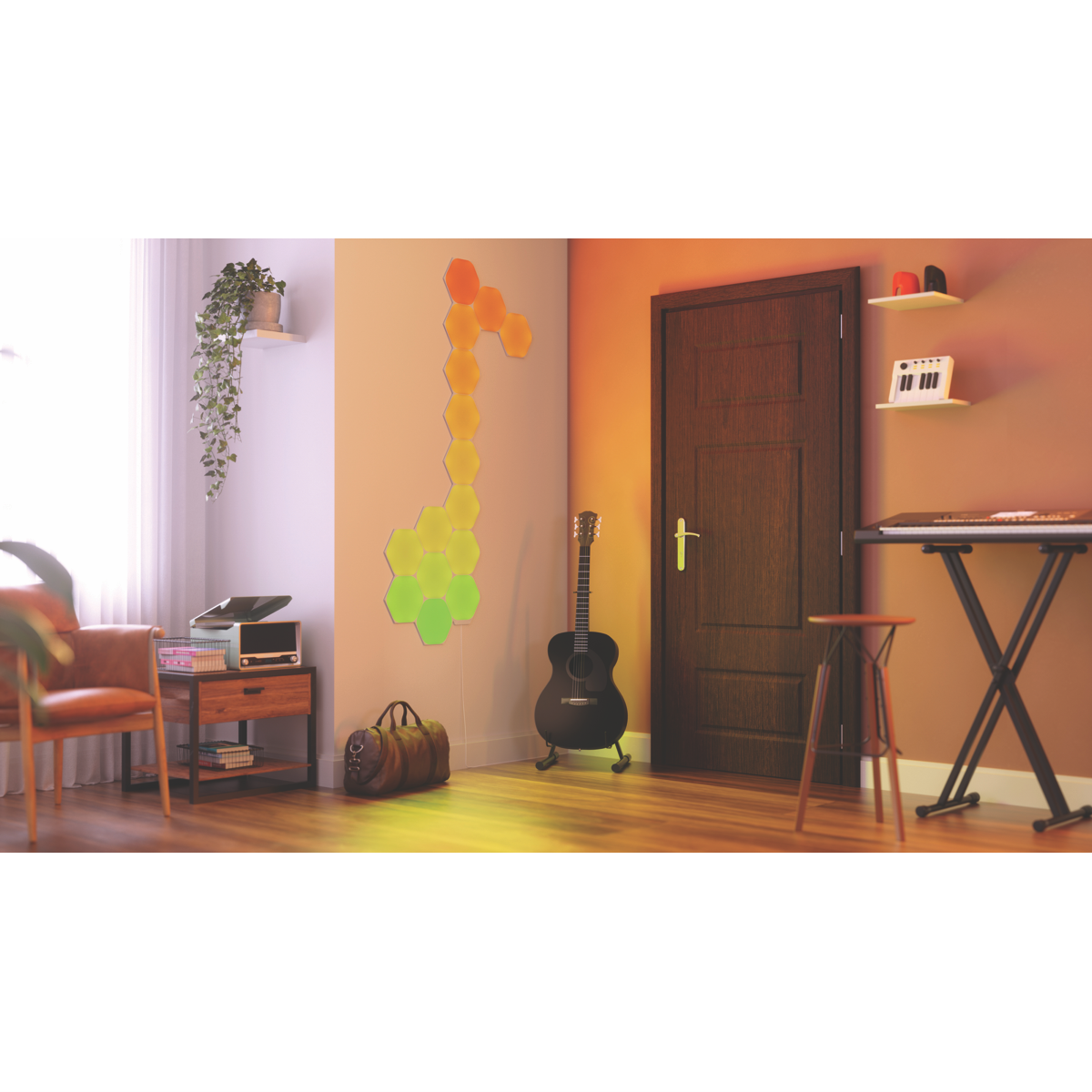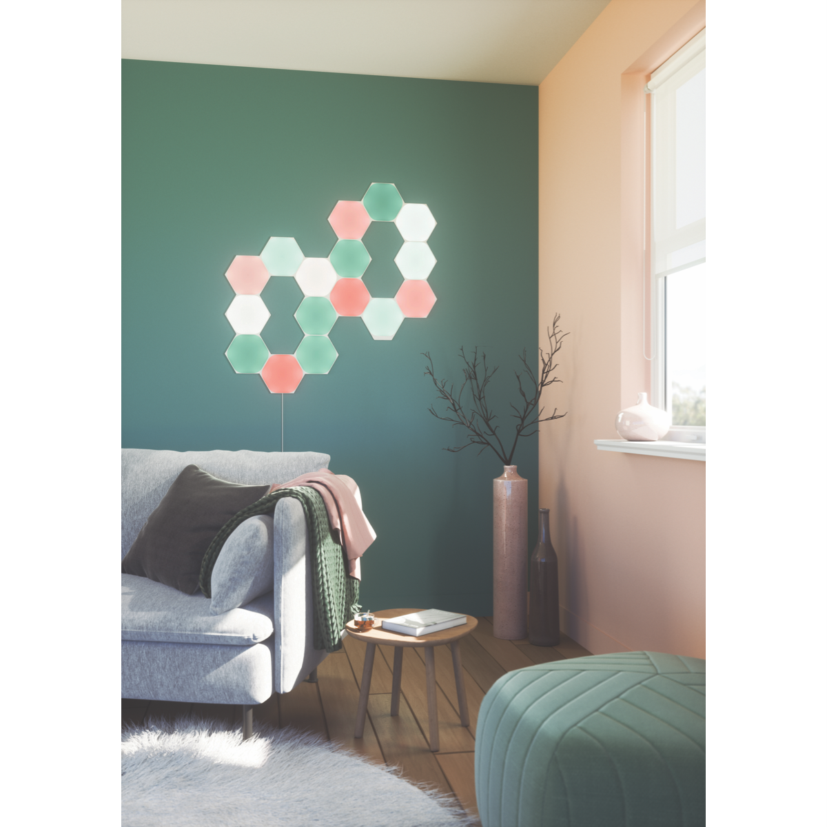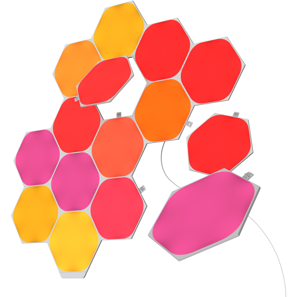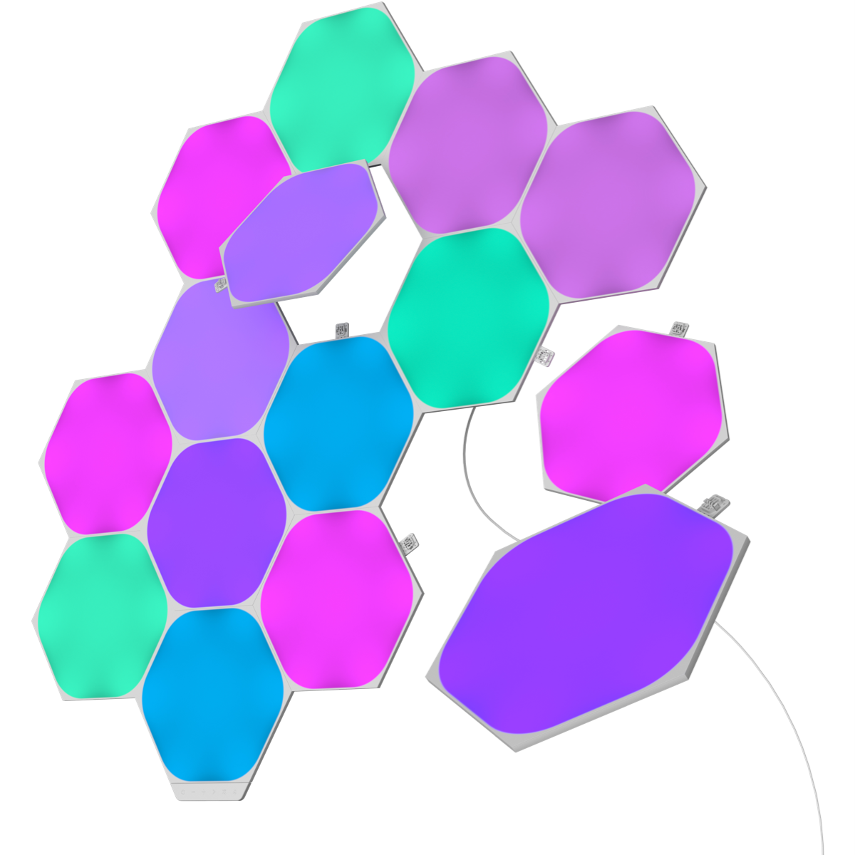 Create an immersive lighting experience with the Nanoleaf Shapes Hexagons Starter Kit 15pk. This smart lighting system features 15 uniquely shaped light panels that click together to form custom geometric layouts on your wall. With 16 million colors and 100 lumens brightness you can set the mood in any room. Control your lights via the Nanoleaf app Apple HomeKit Amazon Alexa Google Assistant or voice control. Connect up to 500 light panels in any configuration. Each durable panel is easy to mount and can last over 25000 hours. Personalize your space with a spectrum of colors and lighting scenes. Transform your home with this innovative modular lighting system. The manufacturer's part number for this product is NL42-6005HX-15PK. Learn more about the possibilities with the Nanoleaf Shapes Hexagons.