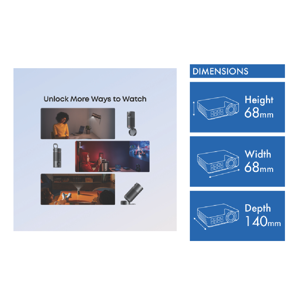 Want to bring the big screen experience anywhere? The NEBULA Capsule Air Projector is a tiny powerhouse that fits in your hand. This mini projector can throw a crisp 100-inch HD image on any wall making movie nights a breeze. With 150 ANSI lumens you'll get a clear picture even in dim rooms. It's smart too running Google TV for easy streaming. The built-in 5W speaker means you don't need extra audio gear. At just 600 grams you can take it camping or to a friend's place without breaking a sweat. The LED bulb lasts up to 30000 hours so you won't need to worry about replacements for years. With Wi-Fi connectivity and a compact 140 x 68 x 68 mm size this projector is ready for any adventure. Comes with a 1-year warranty. Model number: D4112C11.