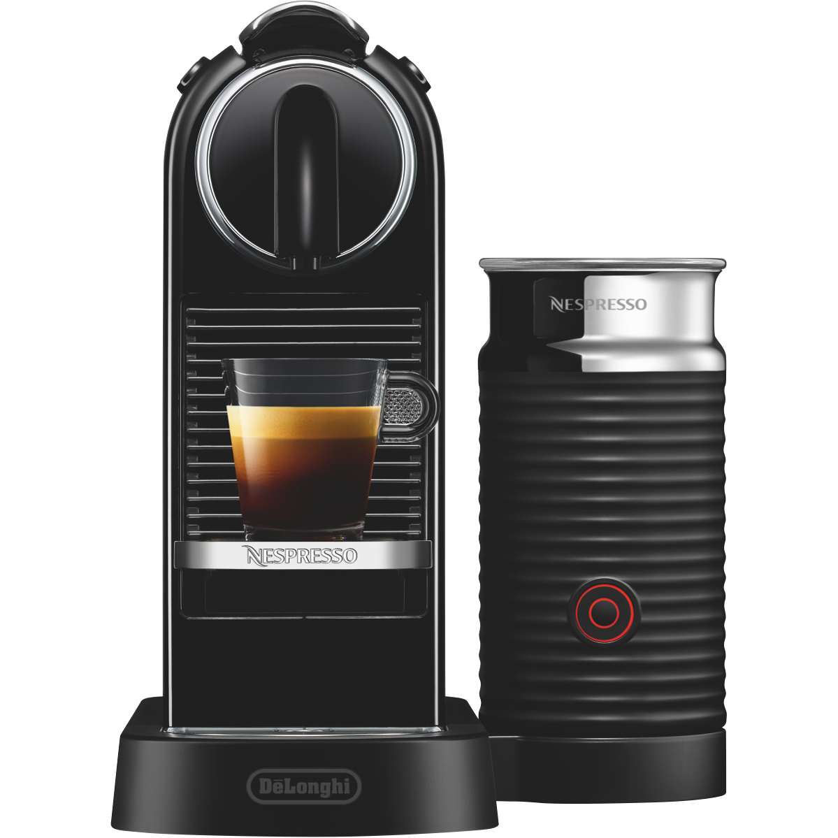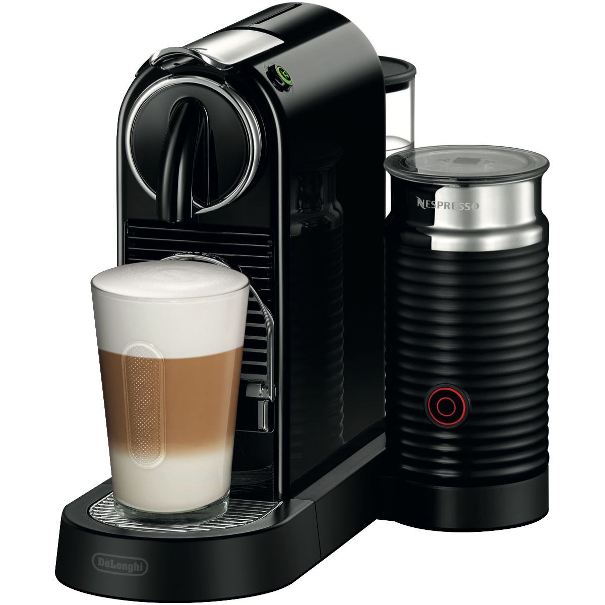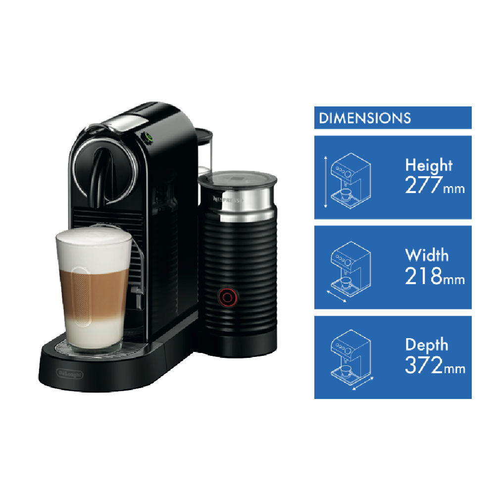 Enjoy a smooth espresso in less than a minute with this Nespresso DeLonghi Citiz & Milk Capsule Machine in sleek black EN267BAE. The capsule machine heats up in less than 25 seconds so your next caffeine hit is never far away. All you need to do is pop in your Nespresso capsule close the lever and select either an espresso or lungo with just the touch of a button. Your coffee shot will always be the perfect length thanks to the Delonghi coffee machine's programmable flow stop function to make that first morning brew as simple as can be. Achieve a golden crema and stop splashes with the two-height sliding cup position tray so your cup is always at the perfect height. Easily create milky coffees including lattes with the Aeroccino milk frother - attach the whisk fill the Aeroccino with milk and at a touch of the button the Aeroccino will heat and froth your milk to perfection ready for you to top up your coffee. If a flat white is your usual order use the milk mixer to heat your milk without froth and foam. You can even create cold frothed milk for iced coffees and other chilly caffeinated concoctions. Create deliciously smooth espressos lattes and more in seconds with this Nespresso DeLonghi Citiz & Milk Capsule Machine.