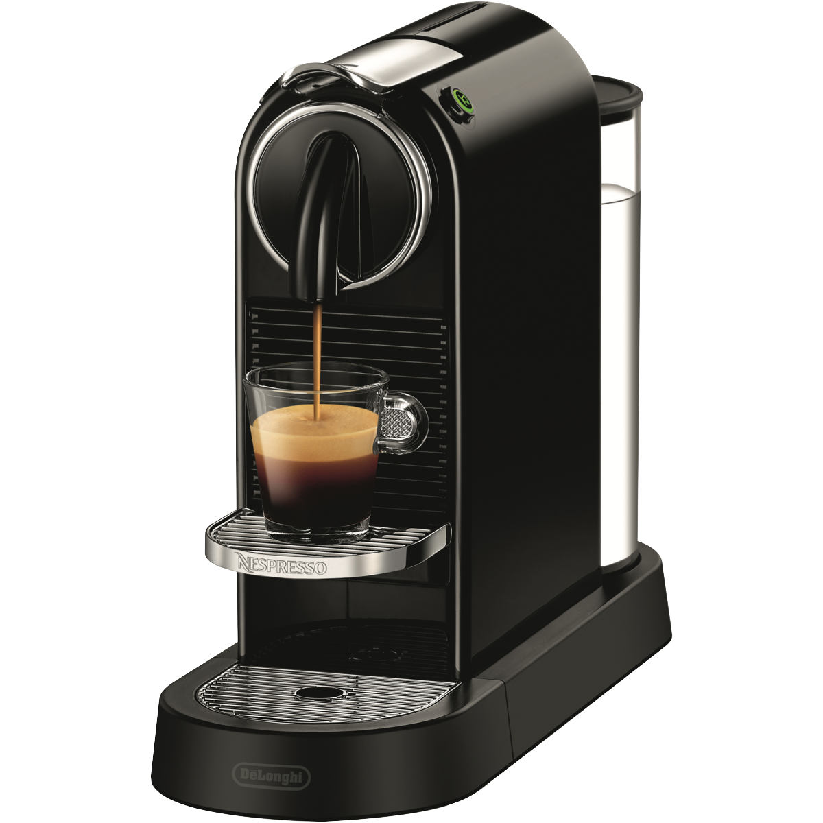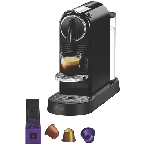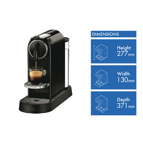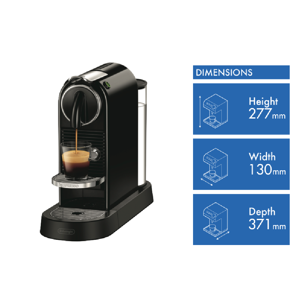 Get your morning caffeine hit in seconds thanks to the Nespresso DeLonghi Citiz Solo Capsule Machine EN167B. With a 19 bar pressure pump for maximum performance and coffee extraction - and a thermoblock system for a super-fast heat-up time - this Nespresso coffee machine delivers optimal temperature and that distinct Nespresso coffee aroma for a delicious morning brew without the wait. With your Nespresso capsules in hand select either the Espresso or Lungo pre-set button for your preferred coffee length and Nespresso Citiz will automatically stop brewing at the desired level. With sliding cup support this capsule coffee machine easily caters for your favourite espresso cup - or for a taller glass if lungo is your preference. It will auto switch off after nine minutes of inactivity to save energy and this great little coffee machine is also compact in size to take up minimal space on your kitchen bench.
