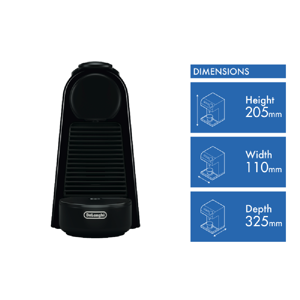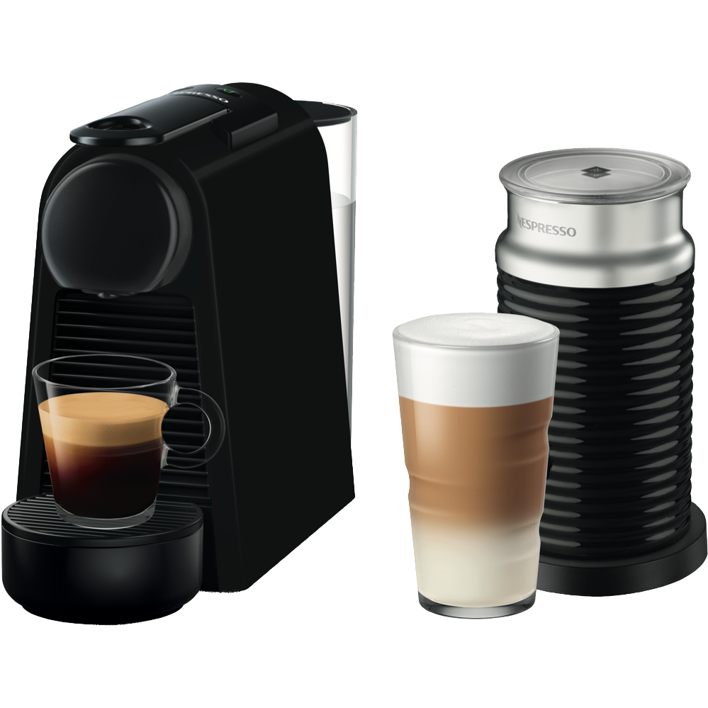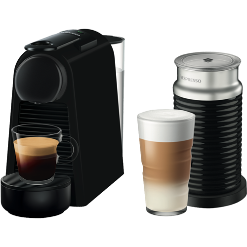 Discover a compact coffee solution designed for small spaces with the stylishly matte black Nespresso Essenza Mini. This single-serve capsule machine heats up in just 25 seconds and brews espresso or lungo with 19 bars of pressure extracting the optimal flavor from each Nespresso capsule. With a water tank capacity of 600mL and an eco mode that activates after 3 minutes this 1200W machine provides convenience without excess energy use. The included Aeroccino provides smooth hot or cold milk froth to complement your coffee creations. Measuring just 110mm wide this slim Essenza Mini fits neatly on your counter or desktop. Prepare cafe-quality coffee at home without the footprint with the reliability of a 2 year manufacturer's warranty. The manufacturer's part number for this product is EN85BMAE. Give yourself the gift of great coffee with the space-saving ingenuity of the Nespresso Essenza Mini & Milk.