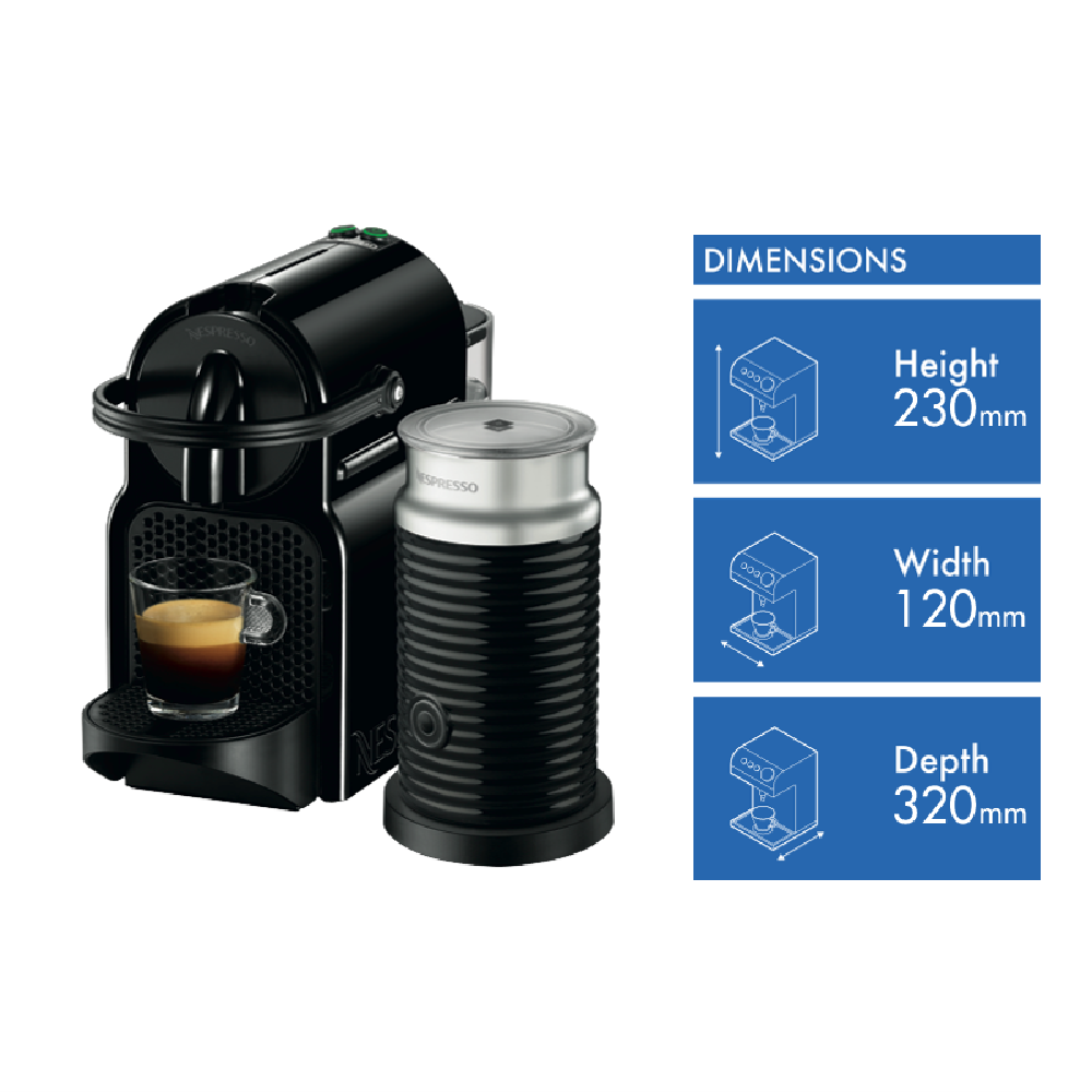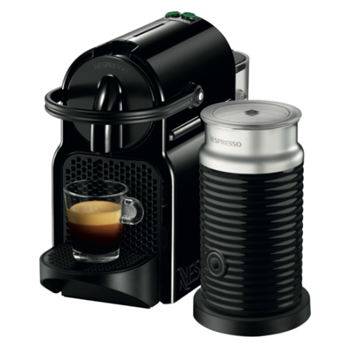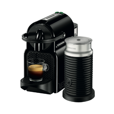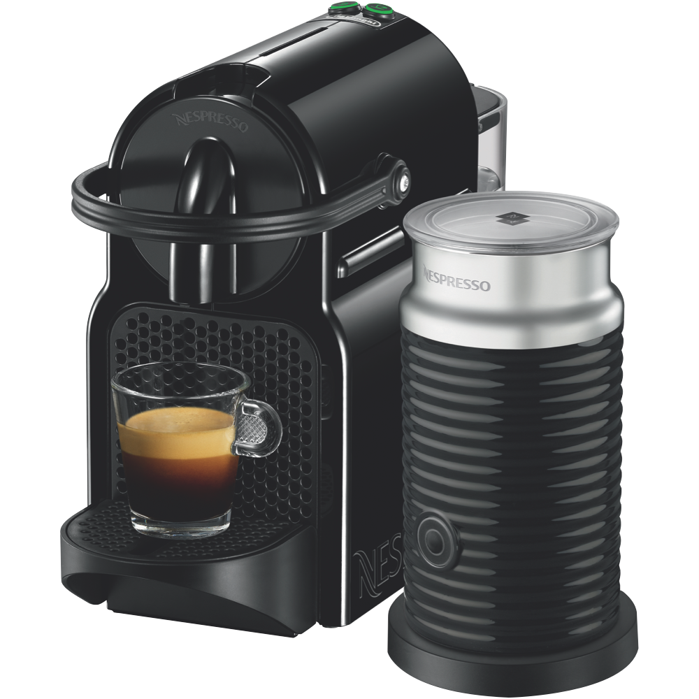 The Nespresso Inissia coffee machine delivers delicious espresso and long coffee with an easy one-touch operation. This compact and lightweight capsule coffee maker features Nespresso's unique extraction system that delivers barista-grade beverages by perfectly controlling water temperature and flow. With a rapid 25 second heat-up you can enjoy an authentic cup of coffee in moments. The folding drip tray accommodates taller glasses while the energy-saving automatic power off ensures minimal electricity usage. The bundle includes 16 Grand Cru capsules to sample a variety of bold balanced and smooth coffees. Froth milk manually with the Aeroccino milk frother for creamy cappuccinos or lattes. Backed by a 2 year warranty the Inissia coffee machine's versatility speed and simplicity make it the perfect starter machine for espresso lovers. With a sleek black finish and small footprint it is an attractive fuss-free addition to any kitchen. The manufacturer's part number for this product is EN80BAE. Make the most of each morning with a great cup of coffee from the Nespresso Inissia.