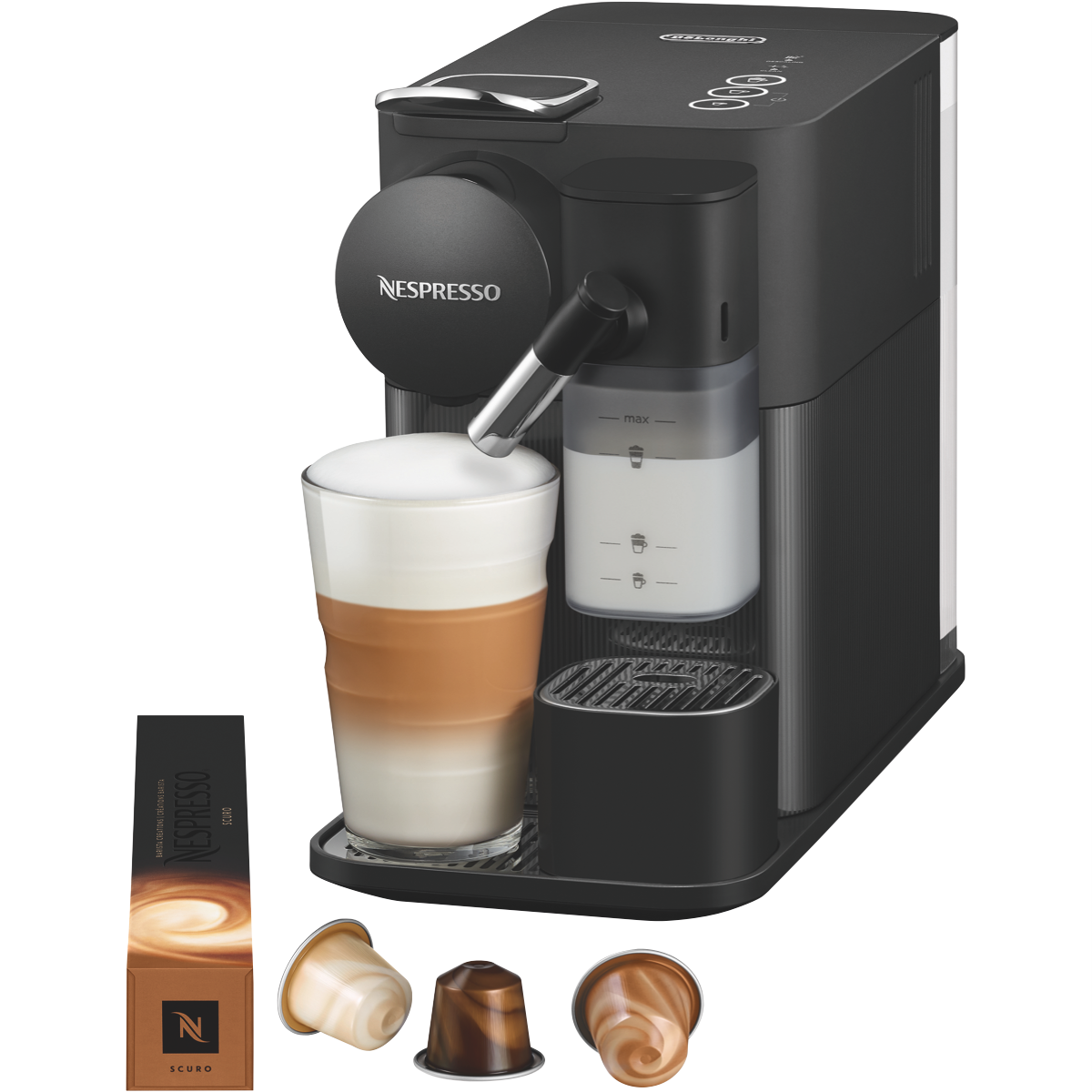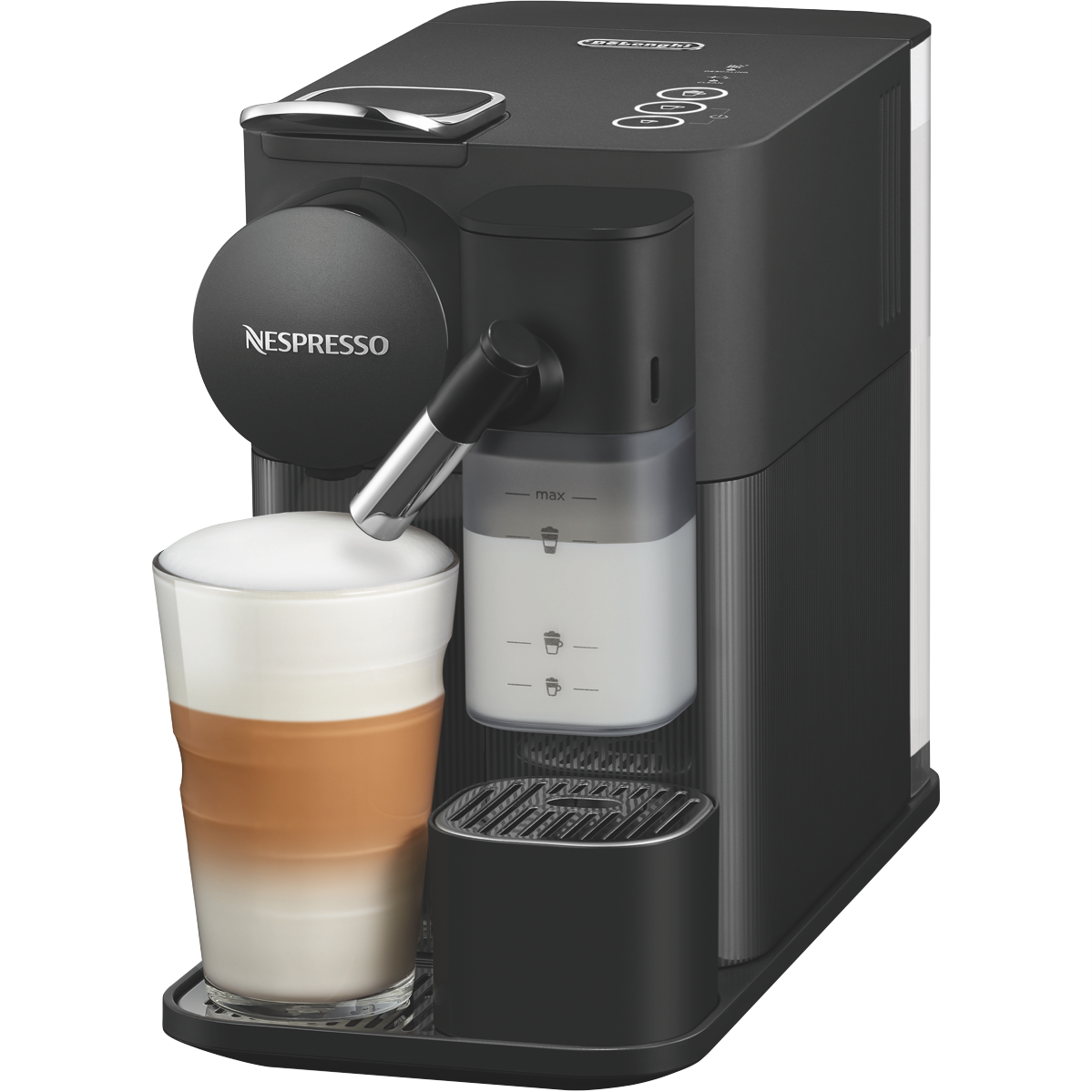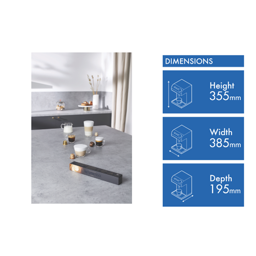 Craft your perfect coffee with the Nespresso Lattissima One Black Capsule Coffee Machine. This sleek black capsule coffee machine delivers barista-style beverages in seconds with its 19 bar pump pressure and fast 25 second heat-up time. The built-in automatic milk frother allows you to create lattes and cappuccinos at the touch of a button. With a generous 1L removable water tank this Nespresso machine can brew cup after cup without refilling. Designed for Nespresso capsules the Lattissima One makes it easy to enjoy cafe-quality coffee from the comfort of home. At just 355mm high and 385mm wide its compact size fits perfectly on your kitchen benchtop. The 1400 watt Thermoblock heating system ensures your coffee and milk are heated to the ideal temperature while the auto-off mode kicks in after 9 minutes of inactivity. Crafted in durable black plastic this Nespresso coffee machine comes with a 2 year warranty for peace of mind. The manufacturer's part number for this product is EN510B. Make every day extraordinary with the Nespresso Lattissima One.