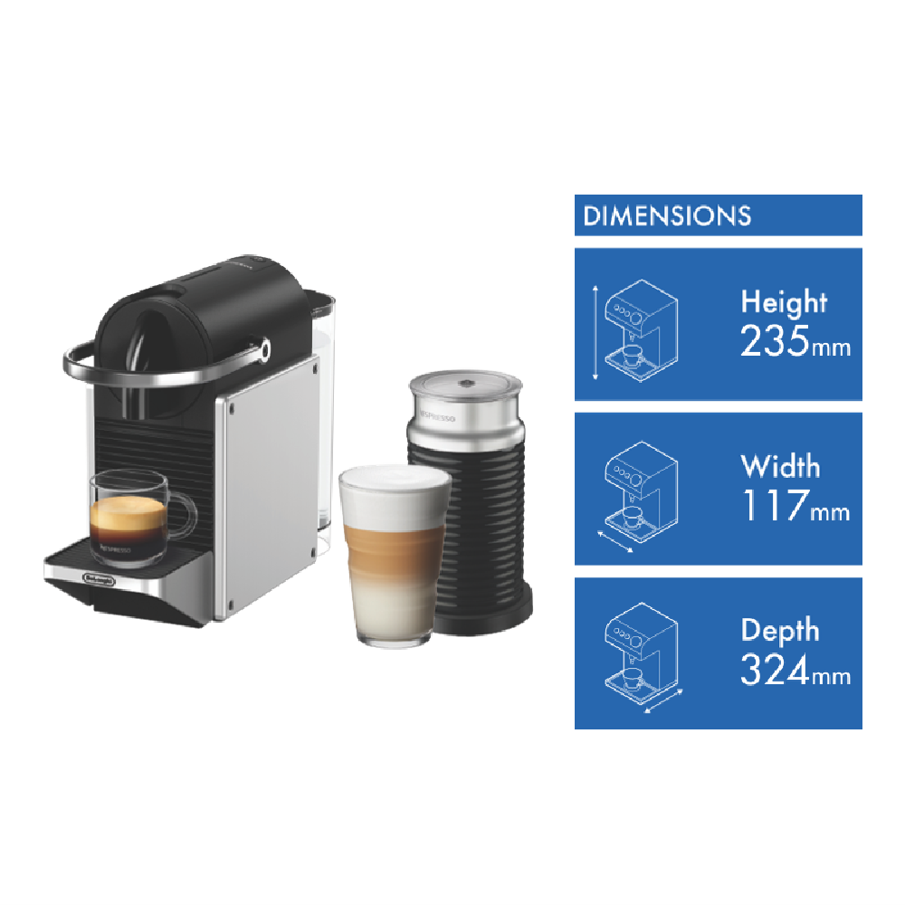 Bring barista-quality coffee right to your kitchen with the sleek Nespresso Pixie capsule coffee machine. This compact powerhouse delivers rich aromatic espresso and lungo with just the touch of a button. The 19 bar pump pressure ensures optimal extraction while the Aeroccino3 milk frother lets you craft creamy cappuccinos and lattes with ease. Featuring a 0.7L water tank and auto shut-off for energy efficiency the Pixie is perfect for coffee lovers on the go. Plus with durable plastic and metal construction it's built to last. Elevate your daily coffee ritual with the Nespresso Pixie EN127SAE.