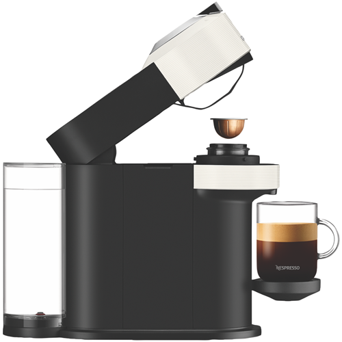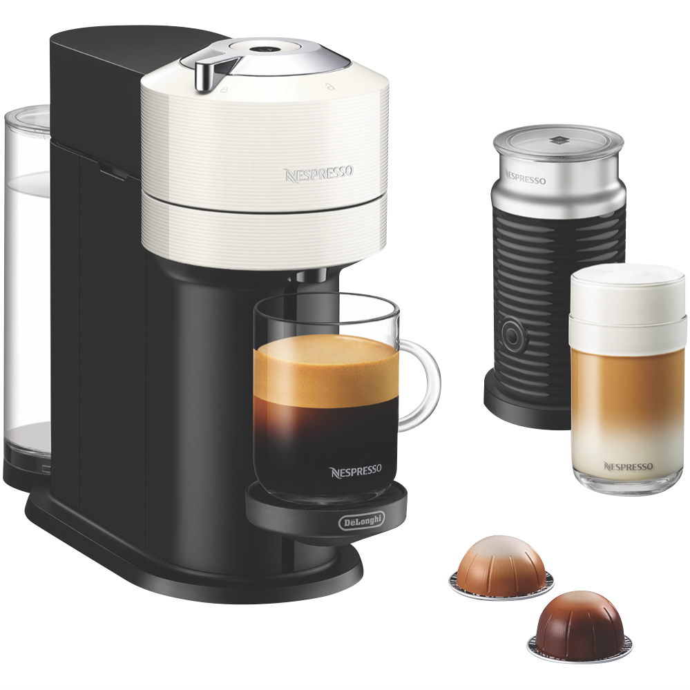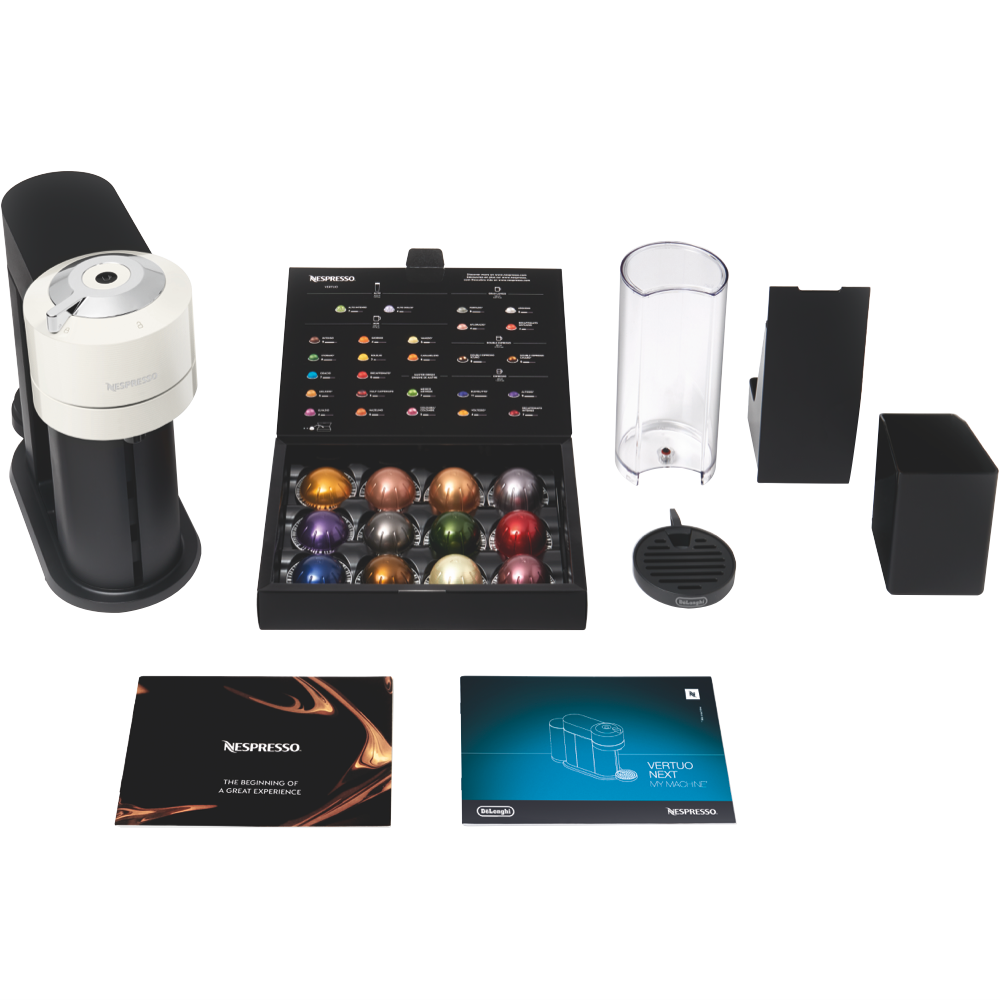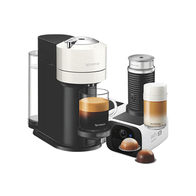Coffee brewed exactly to your liking is effortless with the all-new Nespresso Vertuo Next Bundle - White ENV120WAE by Nespresso. At the touch of a button Nespresso's Patented Centrifusion coffee brewing technology and intelligent barcode technology delivers a perfect in-cup result automatically dispensing a precise volume of coffee topped with a smooth crown of crema just by reading the barcode on your Espresso Double Espresso Gran Lungo Mug or Alta coffee capsule. By masterly controlling the coffee extraction volume water temperature water flow rotation speed and infusion time a precisely-balanced cup is delivered to you every time. Plus the adjustable cup support accommodates all five cup sizes so you can alternate between coffee recipes. Create macchiato cappuccino or cafe latte using the included Aeroccino3 milk frother to top the 40ml of coffee extracted from an Espresso capsule with some hot milk. Taking up minimal benchtop space with a smaller footprint compared to previous Vertuo models this capsule coffee machine also has Bluetooth and Wi-Fi connectivity ensuring you always get the best and up-to-date Nespresso experience by the automatic software update. There are over 25 roast and ground coffee blends to choose from - get started with the complimentary Nespresso tasting capsules box included with Vertuo Next to discover a favourite.