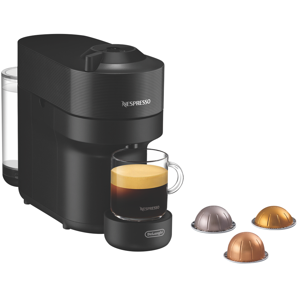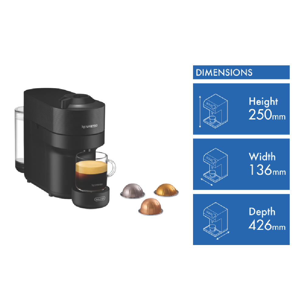 The Nespresso Vertuo POP Black Solo is the latest single-serve coffee machine crafted for coffee lovers seeking barista-style drinks at home. With a sleek compact design and intelligent extraction technology this pod coffee maker delivers rich aromatic espresso double espresso Gran Lungo and regular coffee with just one touch. The Centrifusion technology recognizes each Grand Cru capsule and adjusts parameters to extract each blend's distinct character. Meanwhile the capsule recognition feature automatically adjusts brewing parameters to prepare your desired cup size in 30 seconds. Savor bold full-bodied coffee topped with silky velvety crema that brings out the subtle notes and aroma of each capsule. The automatic ejection and one button operation add to the convenience. Connect this coffee machine to your phone via Bluetooth and WiFi to track capsule use and order replacements. With a 1260W power rating 560ml water tank and small footprint of 250mm height 426mm depth and 136mm width this 3.5kg coffee maker is perfect for apartments. It also shuts off automatically after 2 minutes of inactivity. Bring the cafe home with the Vertuo POP's exceptional coffee that satisfies espresso aficionados. Backed by a 2 year warranty and Nespresso's reputation for reliability.