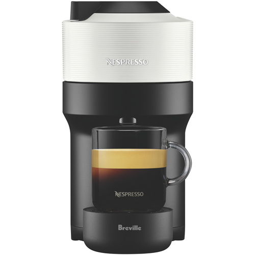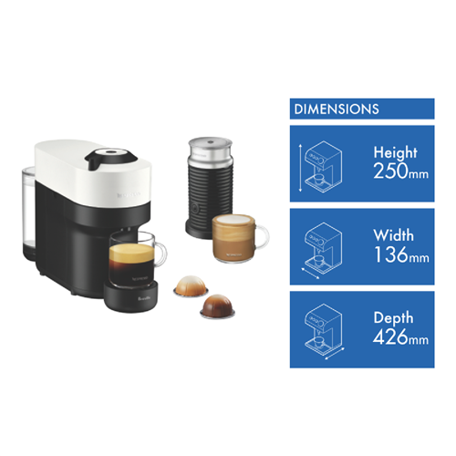 Brew delicious coffees and espressos at home with the Nespresso Vertuo Pop Bundle in a chic coconut white finish. This versatile capsule coffee machine heats up in just 30 seconds with the touch of one button using Nespresso's innovative Centrifusion technology to deliver barista-quality coffee in four cup sizes up to 230ml. The compact Vertuo Pop takes up minimal counter space with its small footprint while Bluetooth and WiFi connectivity allows you to brew from anywhere. The bundle includes the Aeroccino milk frother for making velvety cappuccinos and lattes. With an extra-large 1260ml water tank capsule auto-ejection and auto shut-off this Nespresso makes coffee house beverages easy. The Vertuo Pop also features a 2 year warranty and is part number BNV150WHT4JAN1.