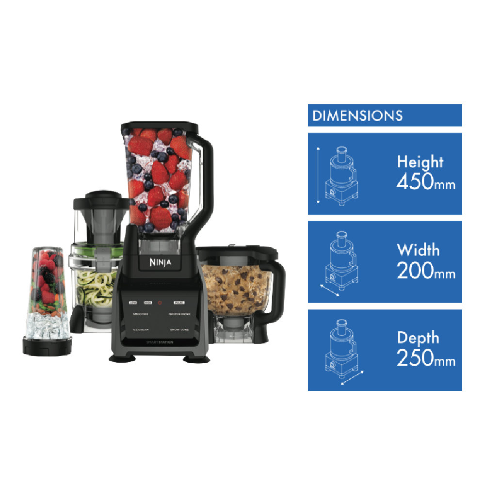 Unlock your inner chef and transform mealtimes with the powerful Ninja Intelli-Sense Kitchen System. This versatile 1200W blender system features Smart Programs designed for optimal results when making smoothies frozen drinks dips purees dough and more. With Total Crushing and Precision Pitcher options 13 speeds and a spacious 2.1L capacity you can blend puree chop mix knead and spiralize ingredients in seconds. The Auto-Spiralizer with interchangeable blades effortlessly creates curly fries or zucchini noodles. With a chute fit for whole fruits and veggies Pro Extractor blades a chopping blade dough blade and single serve blending cup this do-it-all wonder simplifies food prep. Create anything from soups to nut butters shred meats knead pizza dough crush ice and pulverize fruits and veggies with precision. This intuitive system does the thinking for you. The safety locking lid ensures spill-free pouring. Clean up easily with dishwasher safe accessories. Prepare quick weekday breakfasts or craft restaurant worthy creations at home with this versatile time saving kitchen system. Experience the difference intelligent blending makes. The manufacturer's part number for this product is CT682. Bring out your inner chef with the Ninja Intelli-Sense Kitchen System today.