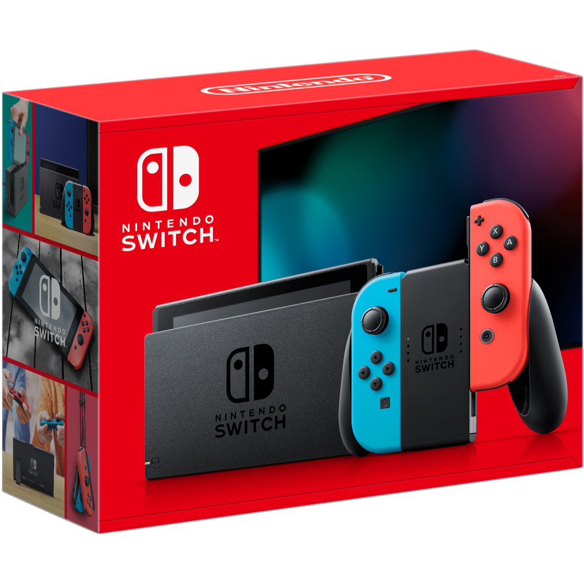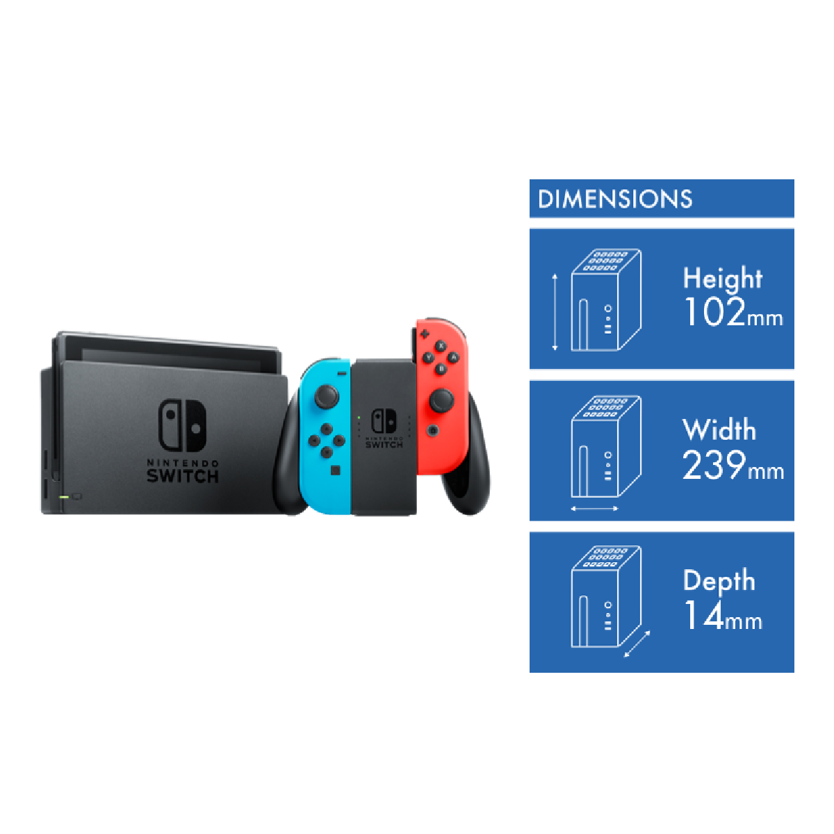 Get ready to play your favorite games anywhere you go with the vivid Nintendo Switch Console in eye-catching neon red and blue. This versatile home gaming system lets you enjoy HD gaming at home or on the go. Simply dock it to your TV to play immersive big-screen games then undock it to keep the fun going in handheld mode with its 6.2-inch LCD touchscreen. Featuring motion controls HD rumble and 32GB of internal storage the Nintendo Switch opens up exciting new ways to game with its Joy-Con controllers. These innovative controllers can be used separately together or shared for multi-player action. Packed with the latest technology the Nintendo Switch console delivers high-definition visuals surround sound audio and compatibility with Nintendo Switch game cartridges for non-stop entertainment. Weighing just 0.39kg with a slim compact design this portable home console goes wherever you do. The manufacturer's part number for this product is 99282. Bring home the all-in-one Nintendo Switch console and experience gaming freedom.