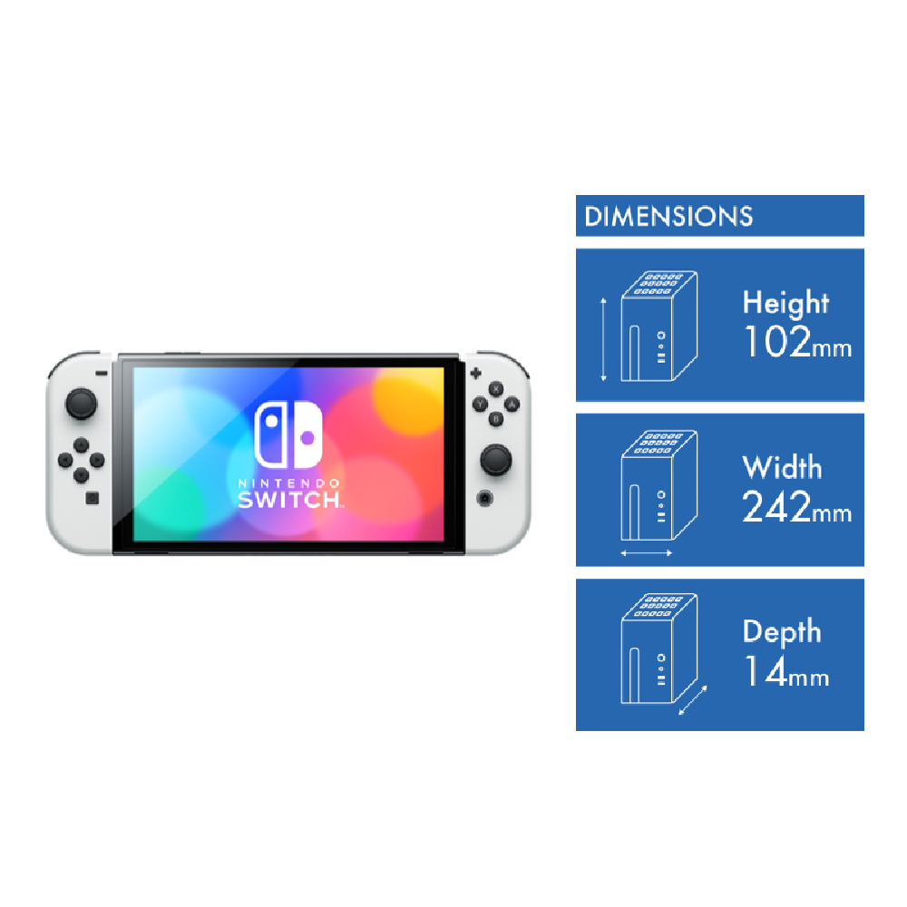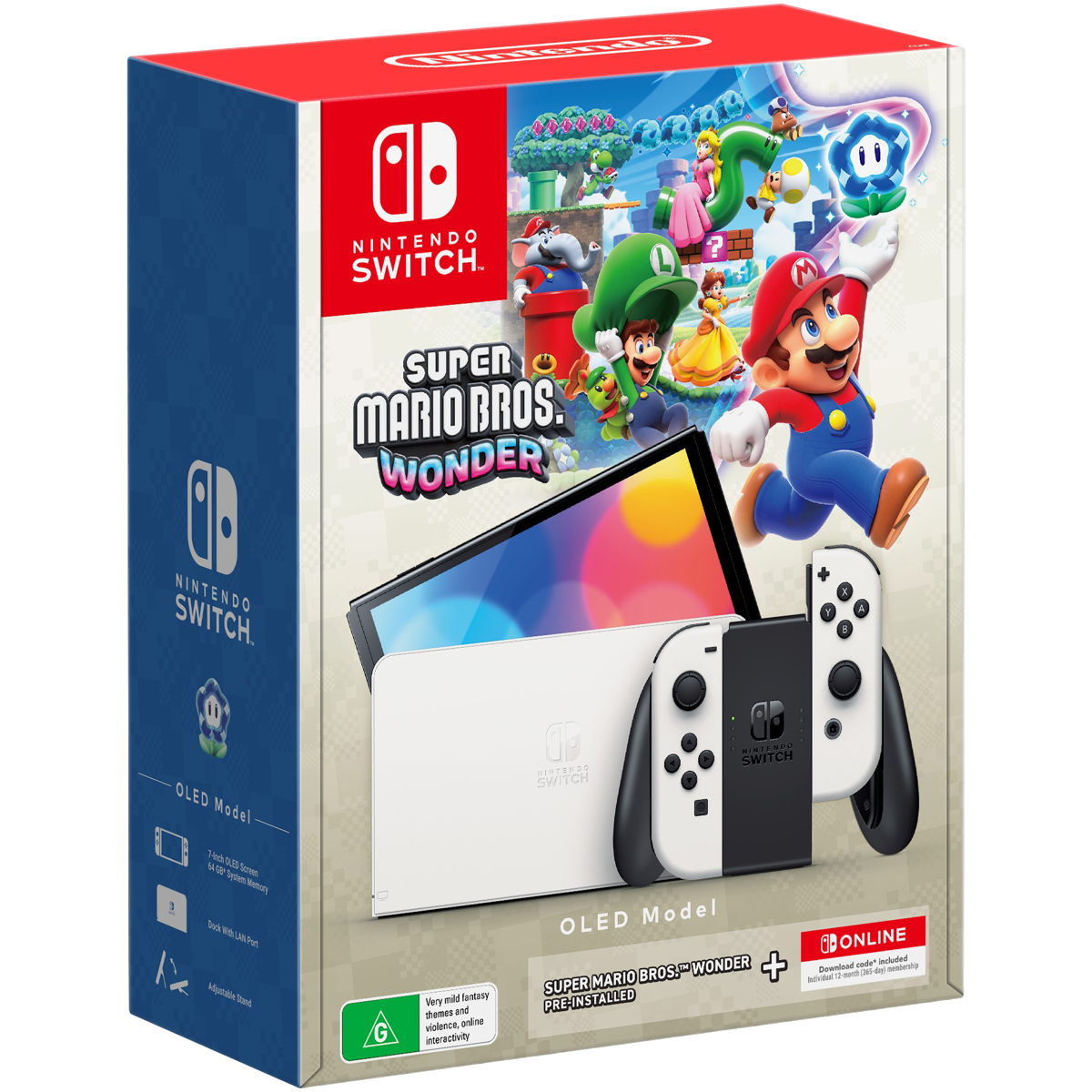 Experience the wonder of Nintendo gaming on this white OLED Switch bundle featuring Super Mario Bros. Wonder pre-installed. The vibrant 7-inch OLED screen brings Mario's adventures to life with rich colours and crisp 1280 x 720 resolution. With 64GB of storage you'll have plenty of space for games beyond the included Mario title. The portable console includes headphone jack controllers and stereo sound for immersive gameplay anywhere while both wireless and LAN connections keep you connected to friends. Your purchase includes a 12-month Nintendo Switch Online membership giving you access to classic games and online play. Comes with a 1-year warranty. Model 168738.