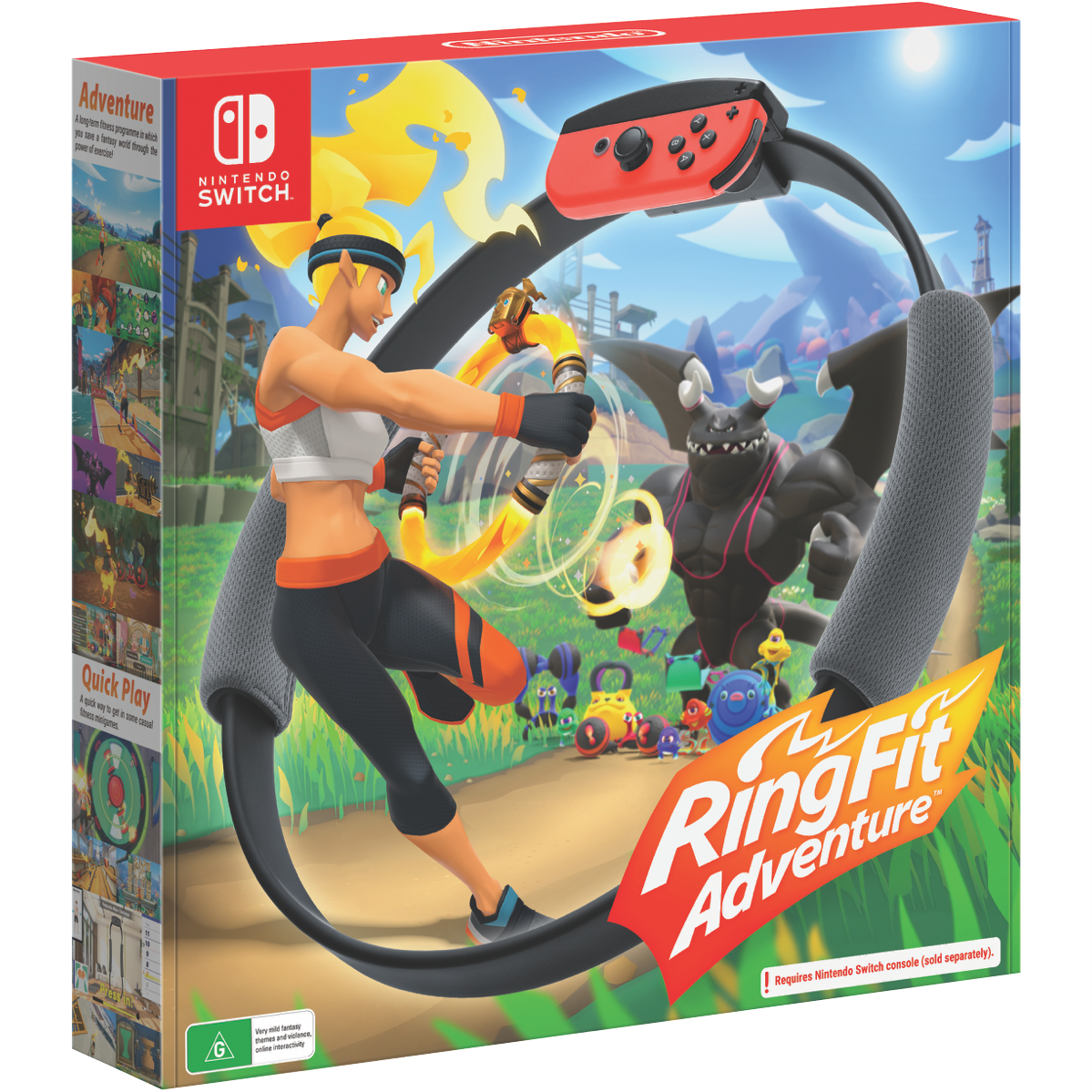 Get ready for adventure with the Nintendo Switch Ring Fit Adventure. This fitness-focused game for the Nintendo Switch console combines innovative accessories with an engaging adventure to get you moving. The Ring-Con and Leg Strap transform your movements into immersive gameplay. Simply attach the Joy-Con controllers into the Ring-Con and strap the Leg Strap to your thigh to begin your quest. The game takes you through a fantastical world as you jog in place do squats and squeeze the Ring-Con to defeat enemies and overcome obstacles. With multiple modes and difficulties Ring Fit Adventure offers a fun interactive workout for all ages and fitness levels. Track your daily progress as you explore lush landscapes and dungeons on this unique fitness journey. The Ring-Con and Leg Strap accessories and Ring Fit Adventure game card are included. Backed by a 1 year manufacturer's warranty. The manufacturer's part number for this product is 98691. Give the gift of fitness with the Nintendo Switch Ring Fit Adventure today.