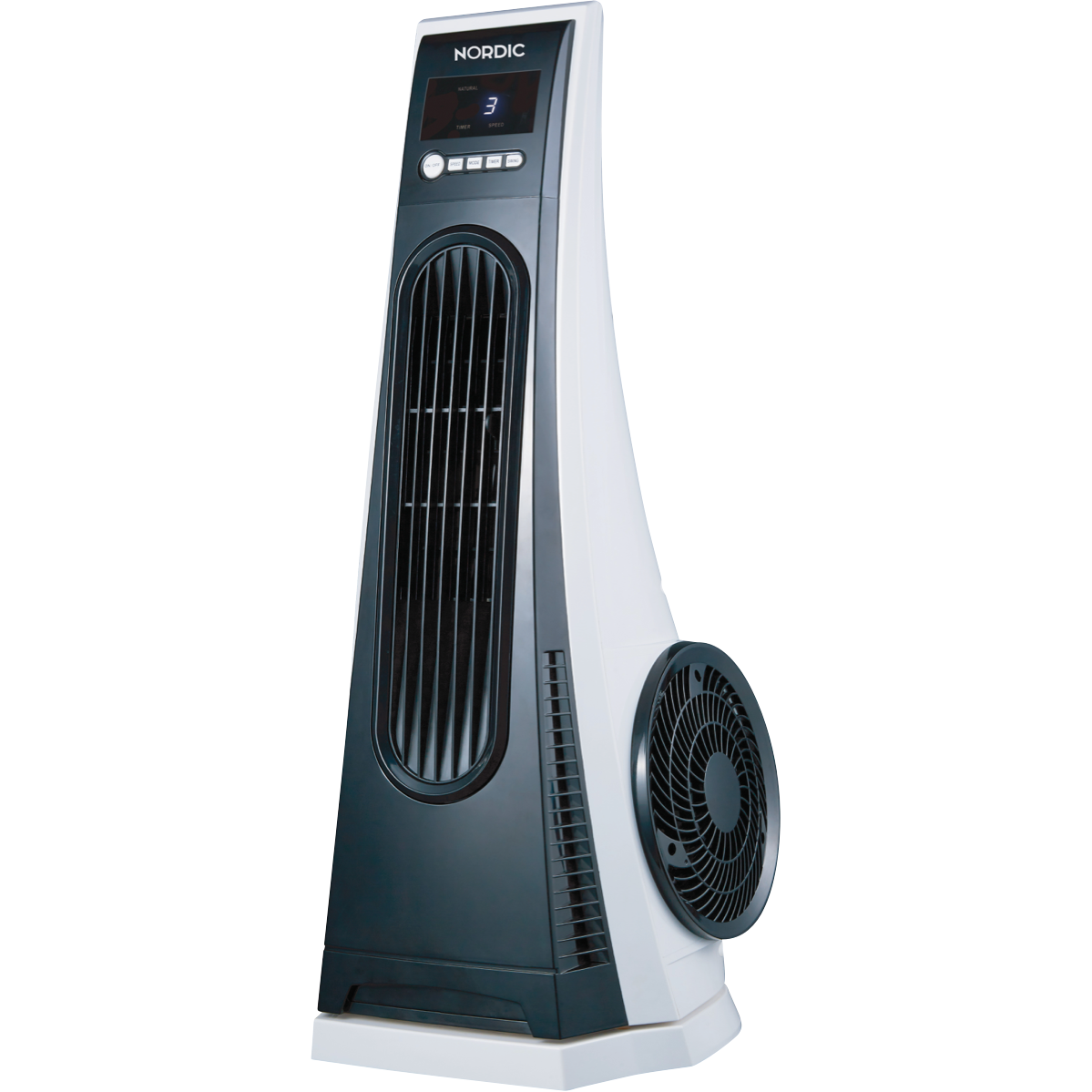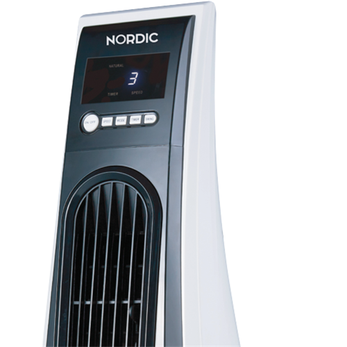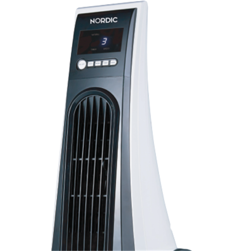 Escape the summer heat with the Nordic 77cm Turbo Tower Fan. This white and black fan features wide-angle oscillation to circulate air throughout the room helping you stay cool and comfortable. With two speeds 8-hour timer and LED display you can customize airflow to suit your needs. The remote control allows you to adjust settings without leaving the couch. This 288mm wide 765mm high tower fan includes a 1-year warranty and manufacturer's part number TF101N. Make your home an oasis this season with the Nordic Turbo Tower Fan.