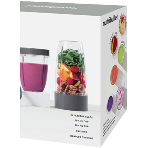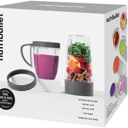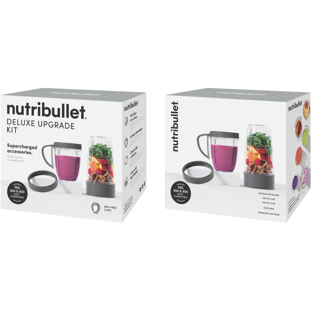 Take your Nutribullet blending to the next level with the Deluxe Upgrade Kit. This attachment set is specially designed to suit Nutribullet 600W 900W Pro and Mega Pack models expanding your blending capabilities. With a 700mL cup 500mL cup extractor blade and two different lip rings you'll have everything needed to create even more nutritious smoothies juices and nut butters. The larger cups allow you to make bigger batches while the included comfort lip ring provides an easy-grip handle for controlled pouring. Blend mix and pulverize ingredients into nutritious drinks and meals with ease. The extractor blade powers through tough ingredients like seeds ice and frozen fruit thanks to its aircraft-grade stainless steel construction. With a 1 year warranty you can blend with confidence knowing this attachment set is made to last. Upgrade your Nutribullet and unlock more blending possibilities with this must-have accessory kit. The manufacturer's part number for this product is NBM-0507M. Check out the Deluxe Upgrade Kit and take your blending experience to new heights.