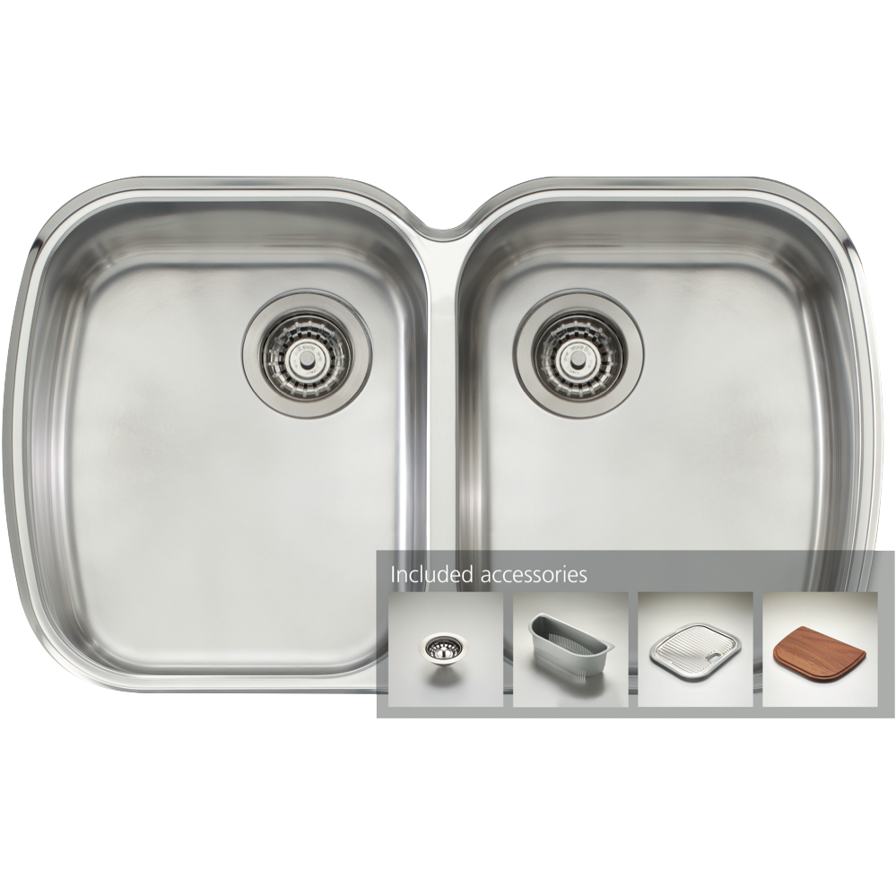 Transform your kitchen with the elegant and functional Oliveri Monet Double Bowl Undermount Sink. This stainless steel sink features a modern design with two spacious D-shaped bowls to maximize workspace. The main 24L bowl with rear drain showcases Oliveri's signature curvaceous style while the smaller 24L bowl adds versatility for multitasking. Both bowls deliver ample room for washing large cookware with ease. This durable easy-to-clean sink includes a bamboo chopping board stainless steel utility tray colander and basket wastes for optimized functionality. With its solid supporting bridge extra capacity main bowl and lifetime warranty the Oliveri Monet sink is built to last while complementing your kitchen aesthetic beautifully. Experience the difference an Oliveri sink makes - this is the perfect choice to upgrade your home. The manufacturer's part number for this product is MO70U. Consider the Oliveri Monet sink for your kitchen today.