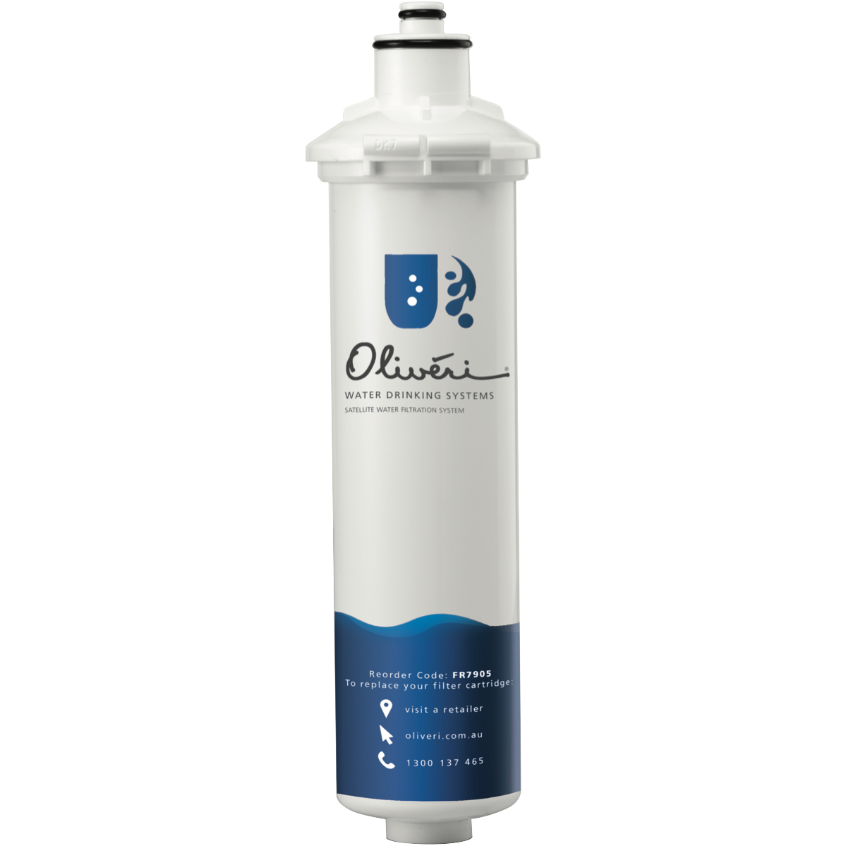 Replace your kitchen sink cartridge with ease and enjoy clean filtered water for years to come with the Oliveri FR7905 replacement cartridge satellite. This inline water filtration system offers 9450 litres capacity or 1 year of use whichever comes first so you can rely on purified water day after day. The quick and easy bayonet fitting makes replacing cartridges a breeze. With the ability to connect to 3-way filter systems this cartridge is compatible with a variety of setups. Filtration down to 500 kPa reduces sediments rust chlorine taste and odour. At 1.9 litres per minute flow rate water pressure stays strong while delivering contaminant-free H2O. Enjoy the convenience of filtered water with this Oliveri replacement cartridge. The manufacturer's part number for this product is FR7905. Give your kitchen a water filtration refresh.