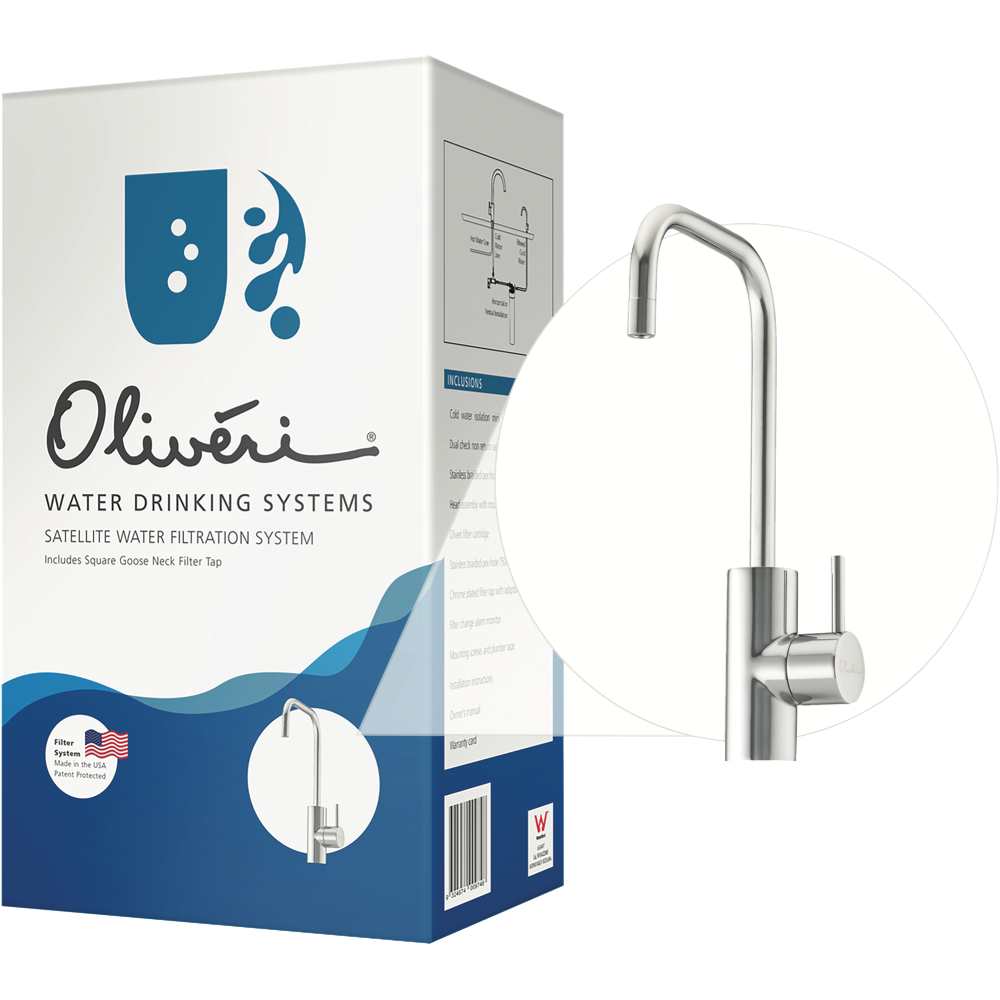 Transform your kitchen into a modern oasis with the Oliveri Satellite Water Filtration System. This stylish chrome tap features a square gooseneck design that provides a full range of motion while filtering water through a USA-made system. Maintaining healthy minerals the multi-stage filtration process uses a patent-protected method to remove impurities and sediment down to one micron. No more plastic water bottles cluttering up your counters. With the simple turn of a faucet enjoy fresh clean water straight from the tap. The sleek satellite system tucks neatly under your sink taking up minimal space while delivering maximum filtration. Durable and easy to install this water filtration system will provide your family with clean great-tasting water for years to come. Upgrade your kitchen with the Oliveri Satellite tap today. The manufacturer's part number for this product is FS7075.